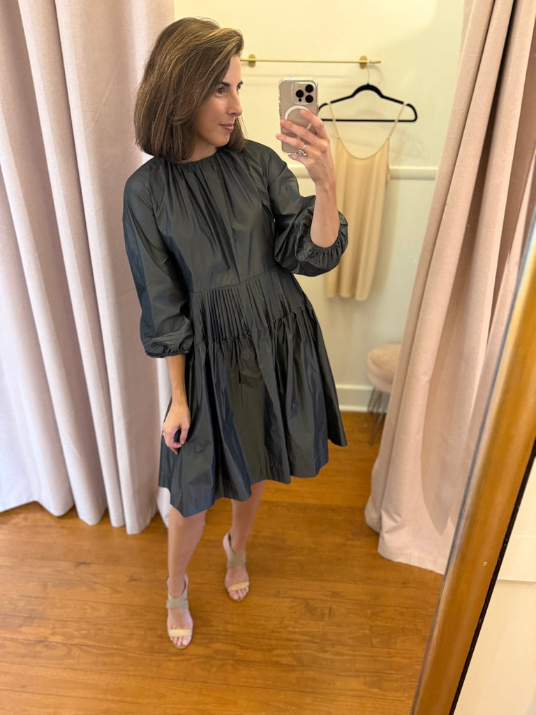 This short dress, made from iridescent taffeta, features a crew neckline, three-quarter length sleeves with stitched pleats and elastic at the cuffs. The short skirt with micro pleats and side pockets at the hips completes the design. Made in Italy.