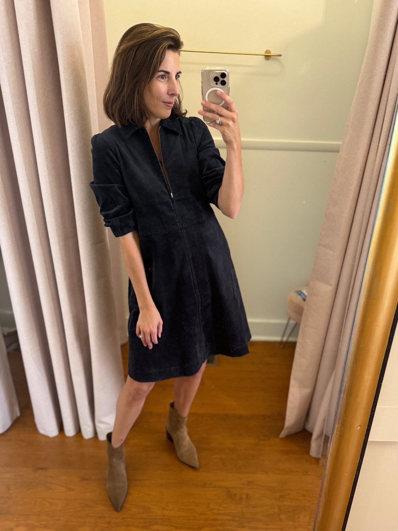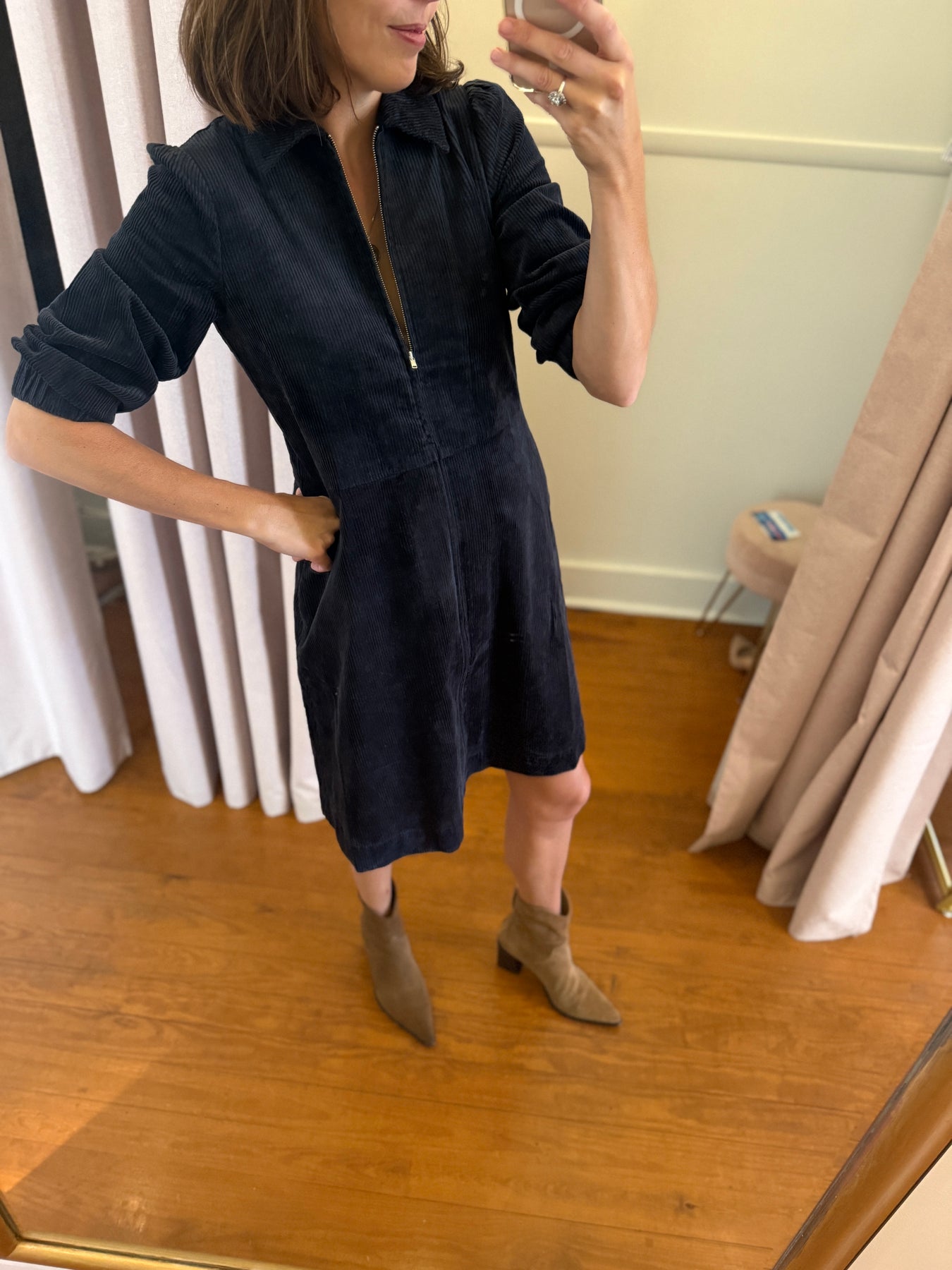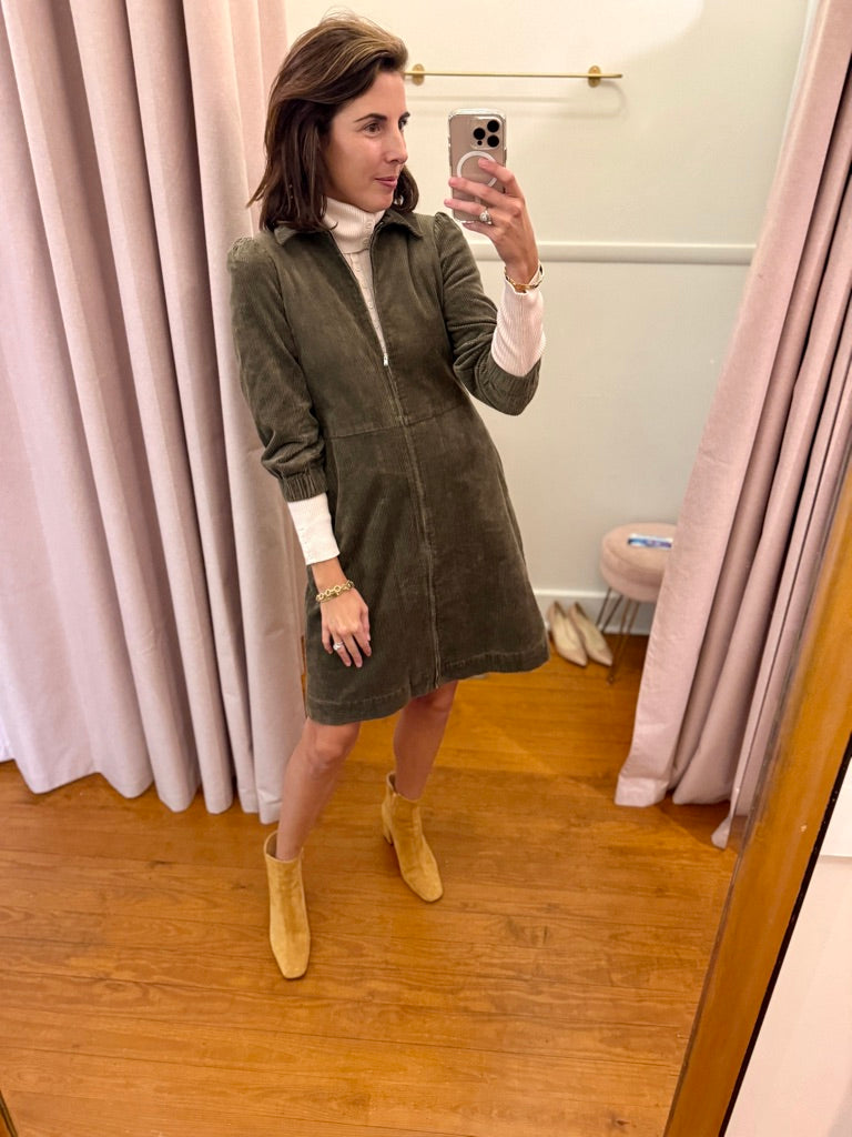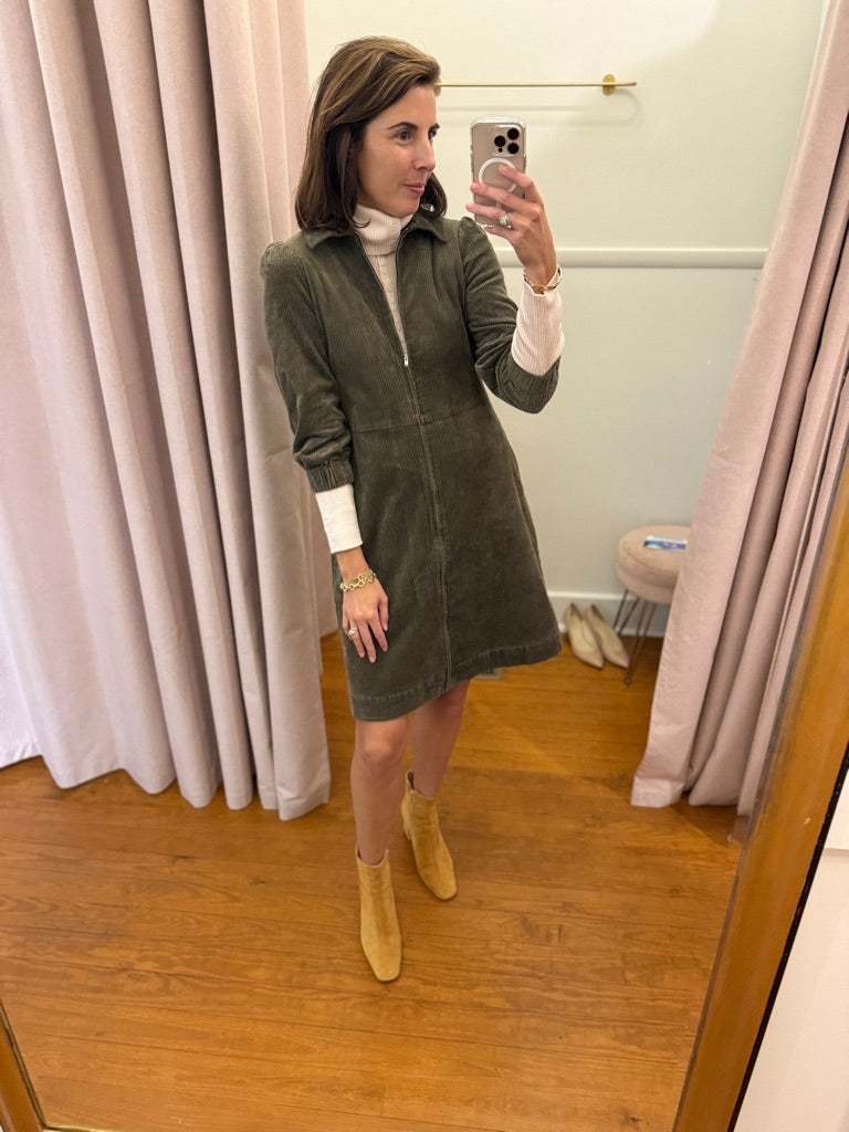 Best selling zip-front corduroy long sleeve dress. Available in navy and olive green