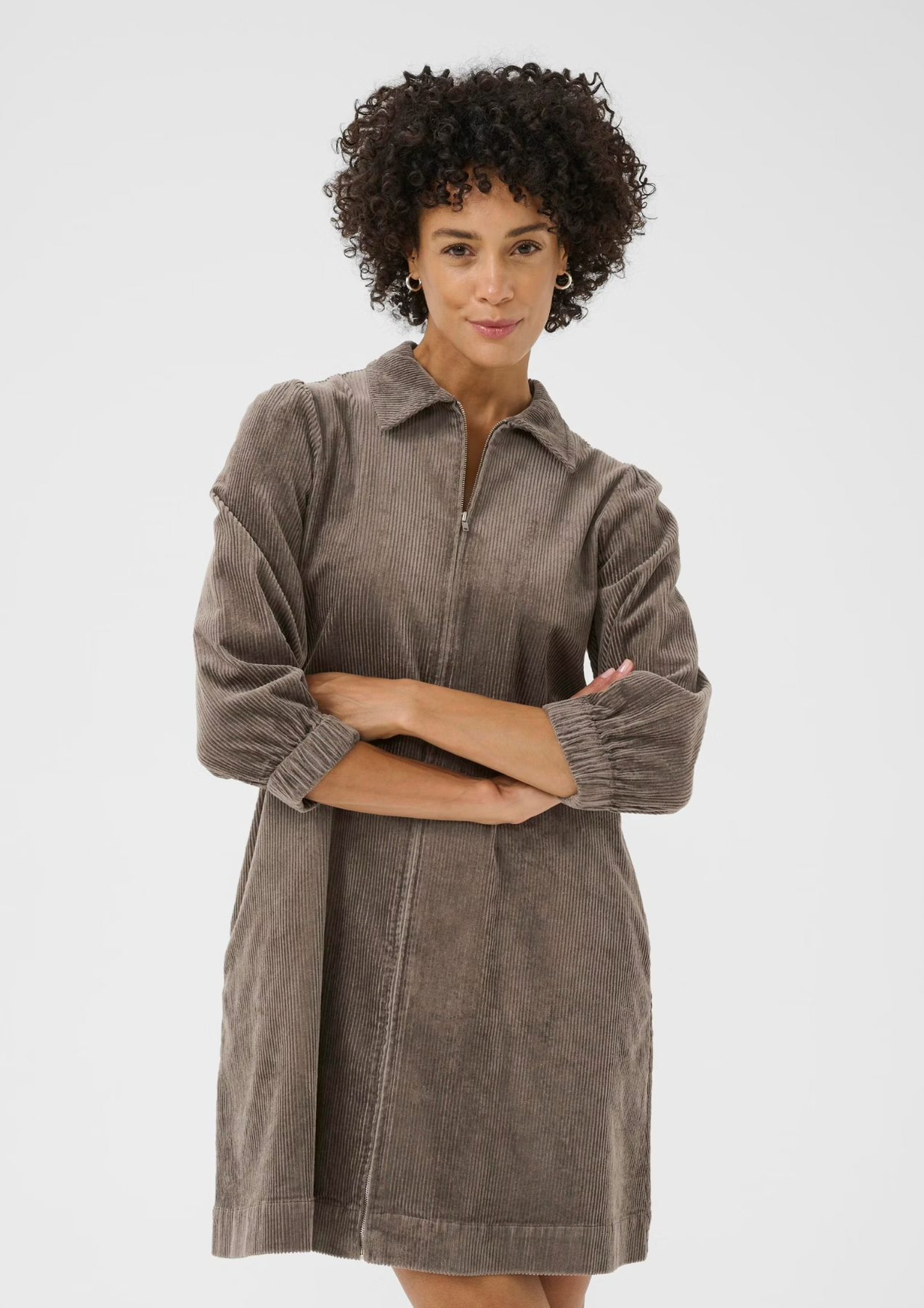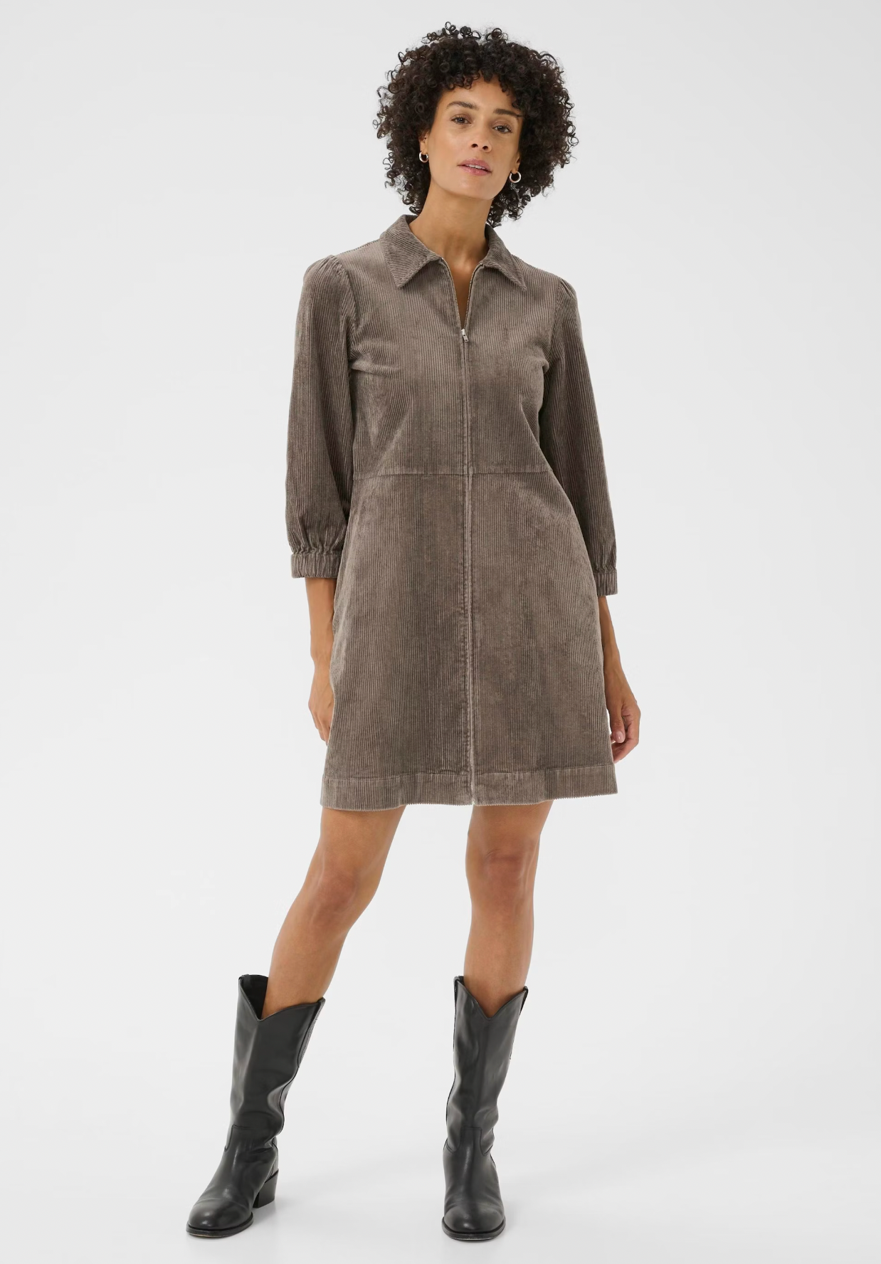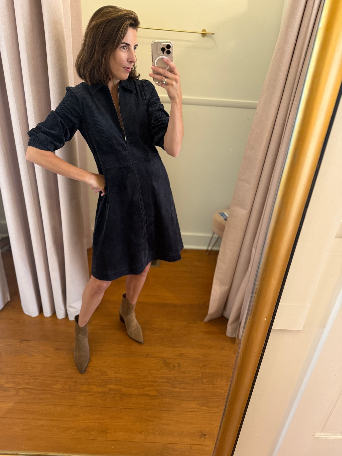 Best selling zip-front corduroy long sleeve dress. Available in navy and olive green
