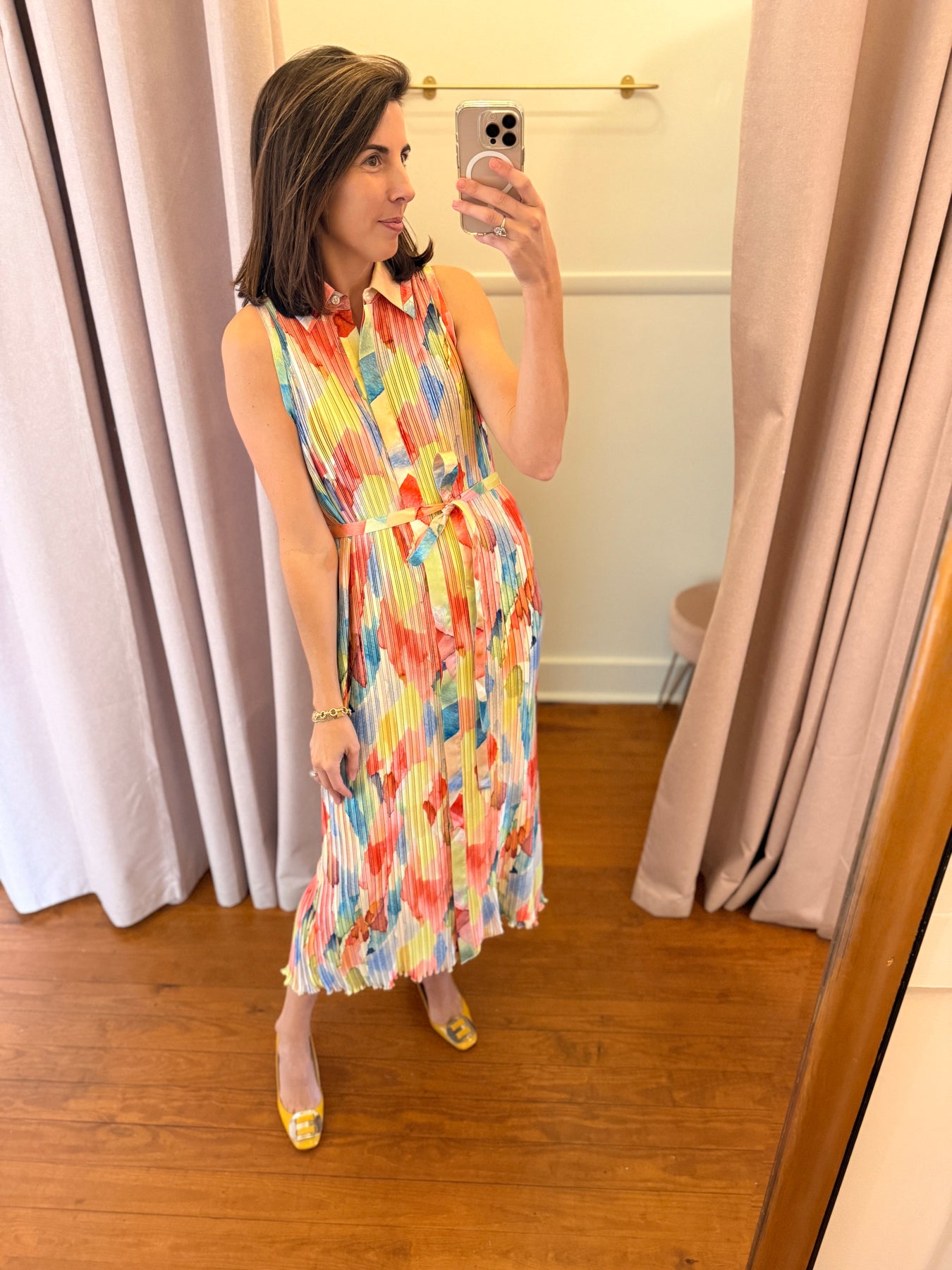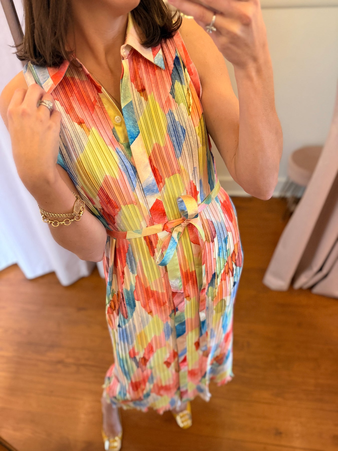 Sleeveless collared maxi dress in a gorgeous print with flattering pleating and a matching self-tie belt. Size S pictured (4/6)