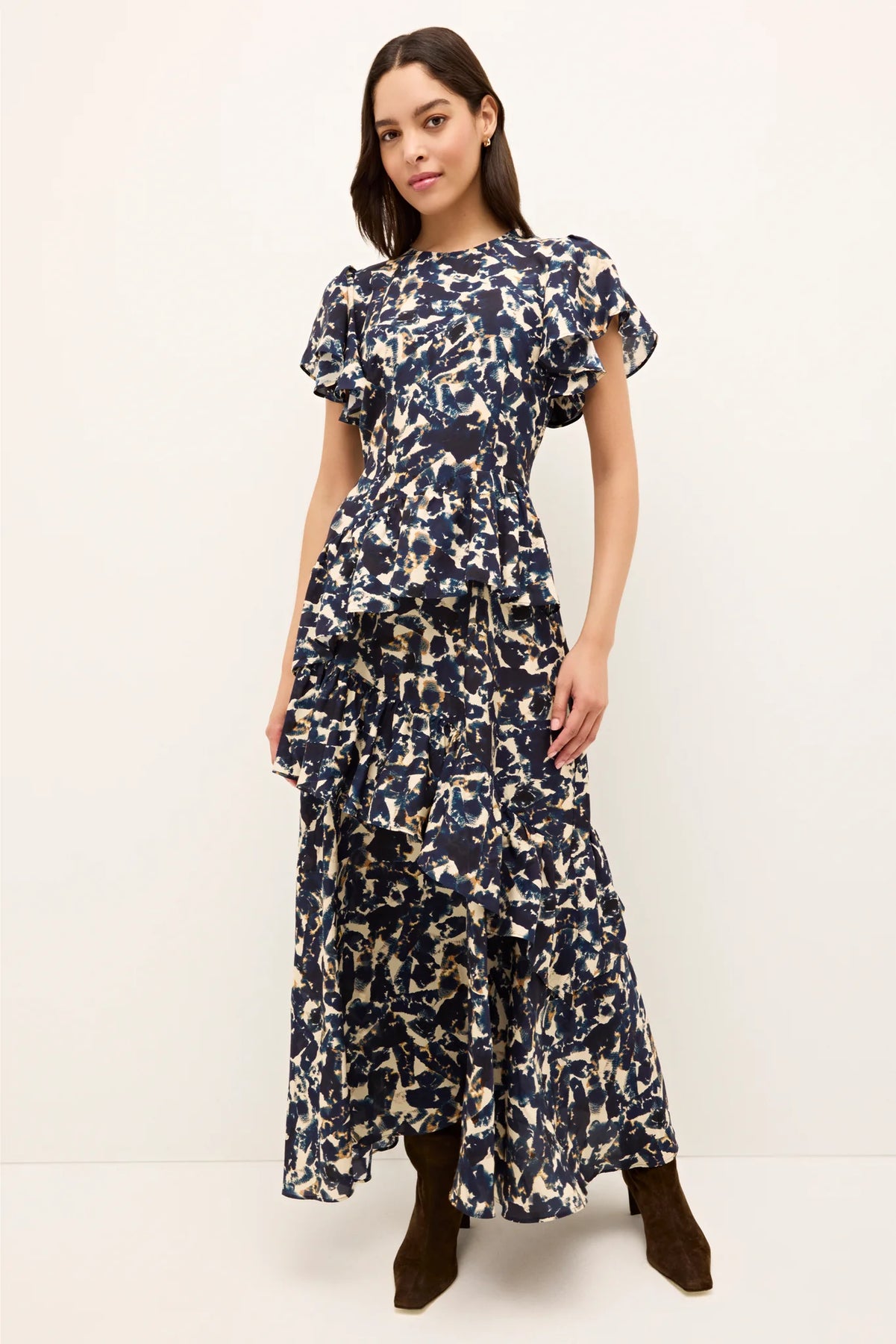 Your new favorite occasion dress has arrived in all of Quinby's tiered, flounced, and printed splendor. Airy silk mix meets Pyrite, our painterly navy print that will be the star of every party. The flattering effect of the fitted top that cascades into a ruffled skirt is both comfortable and effortlessly versatile, taking you from baby to bridal shower or an elevated date night.
