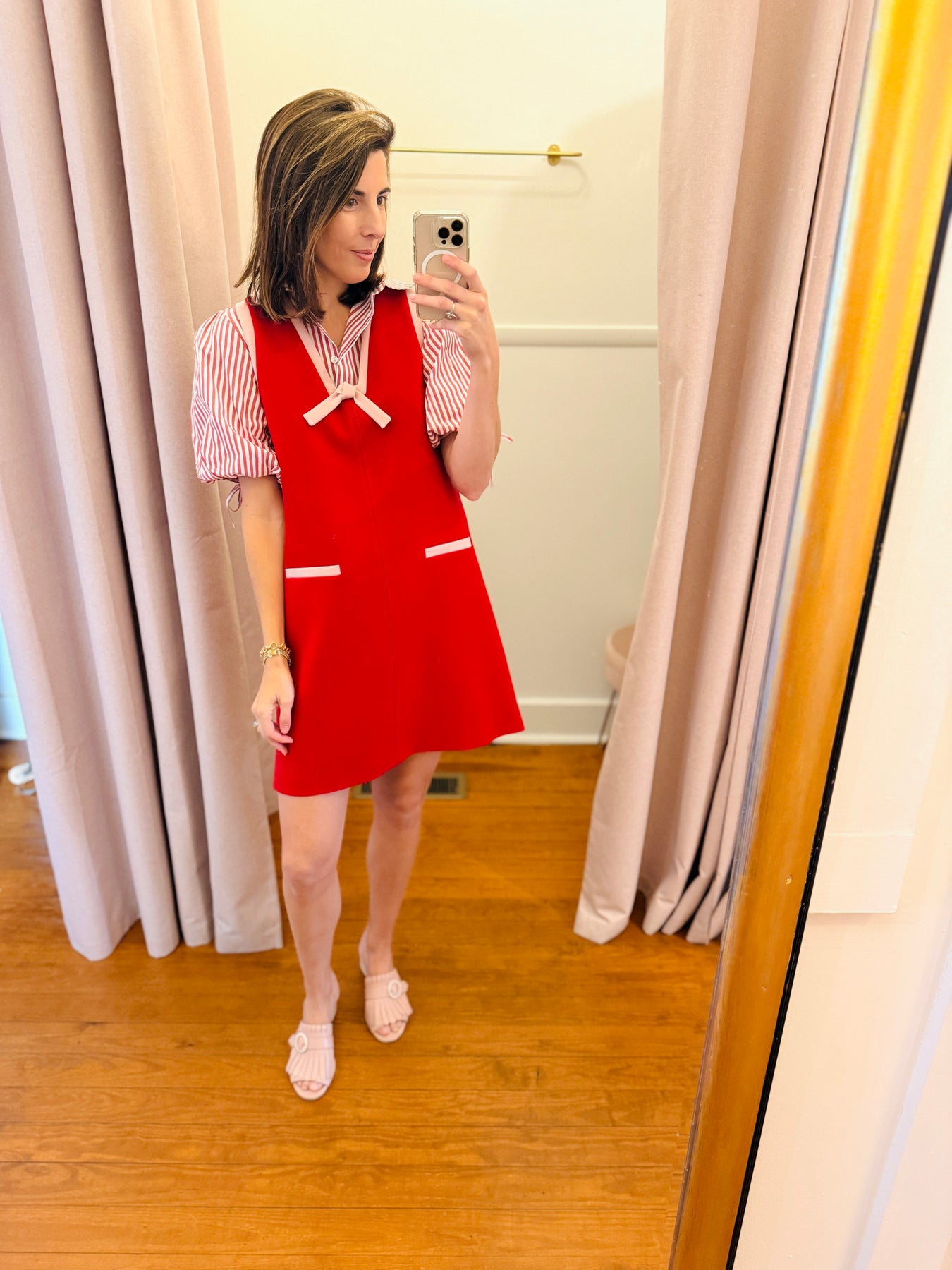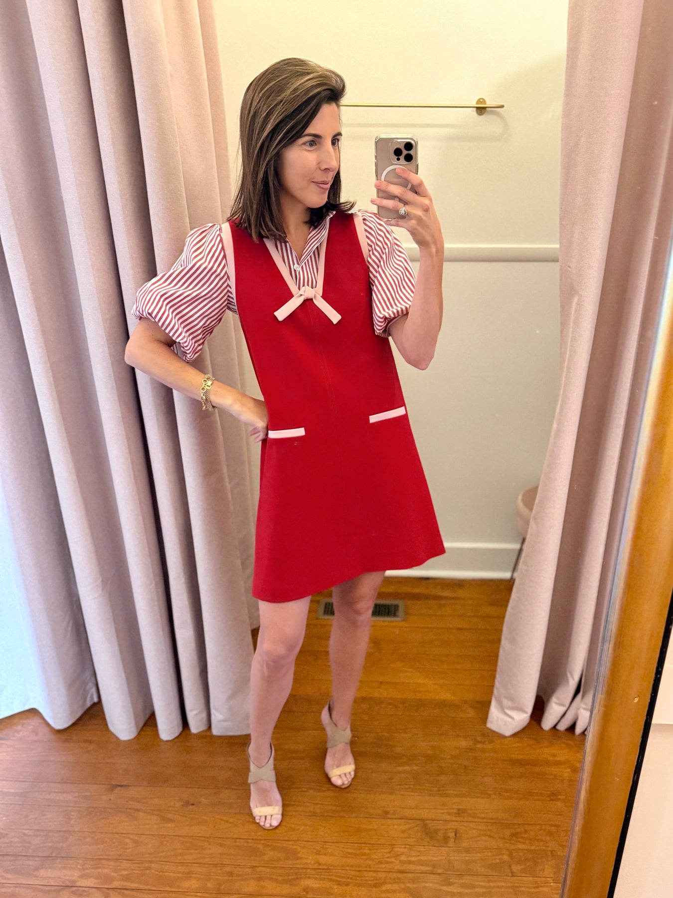 This short, cherry-red dress is sleeveless. It features a V-neck adorned with a small bow and an A-line silhouette. Ultra-preppy, its neckline and welt pockets at the front are highlighted with a pale pink panel. It fastens with an invisible zip at the back.