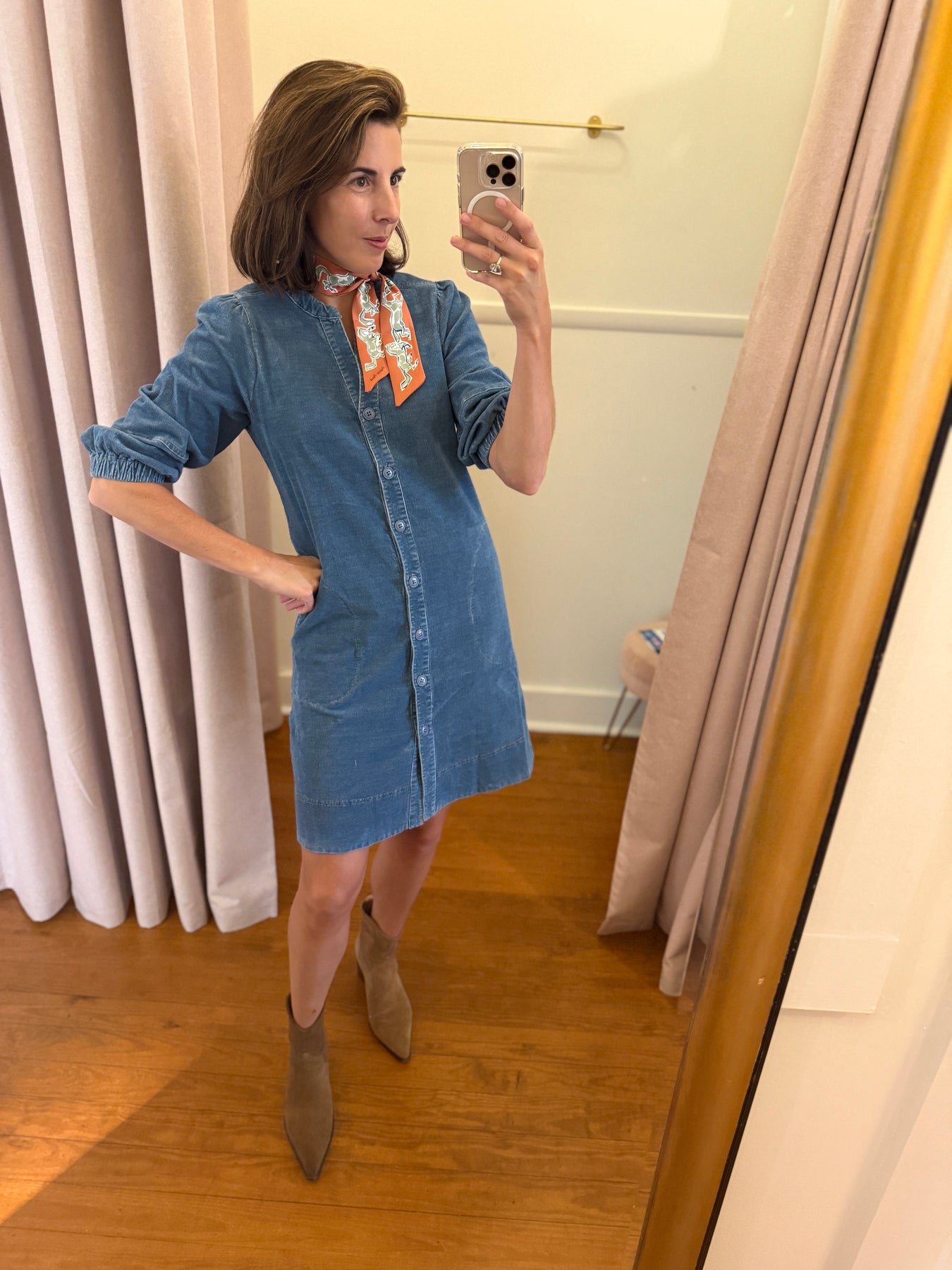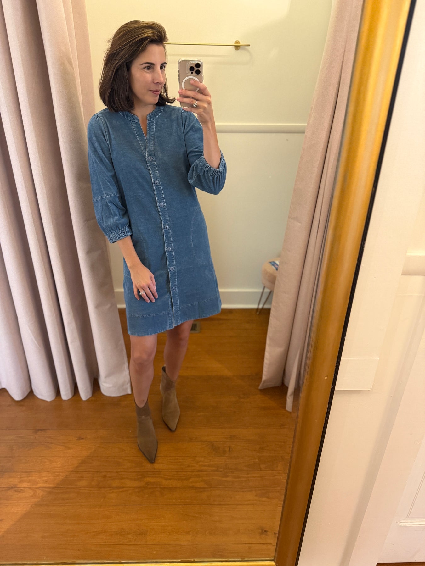 Long sleeve light blue cord dress with buttons down the front