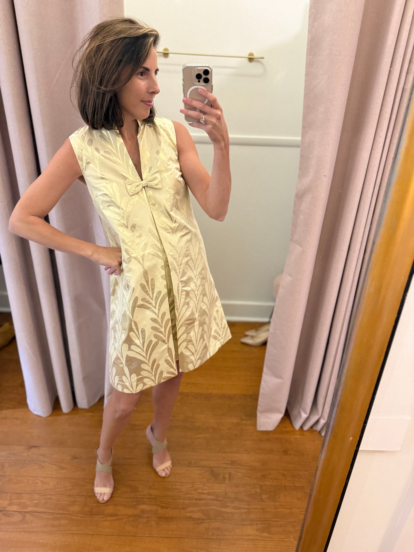 Make a dazzling entrance this holiday season. We took our best-selling Diplomat and turned it around, with the bows on the front for a festive twist, and an exaggerated pleat for a true statement finish. With a flattering V-neck and a unique, seasonal-ready champagne-gold jacquard, this sleeveless mini is perfect for holiday soirées, parties, or any occasion that calls for a touch of sparkle and standout style.