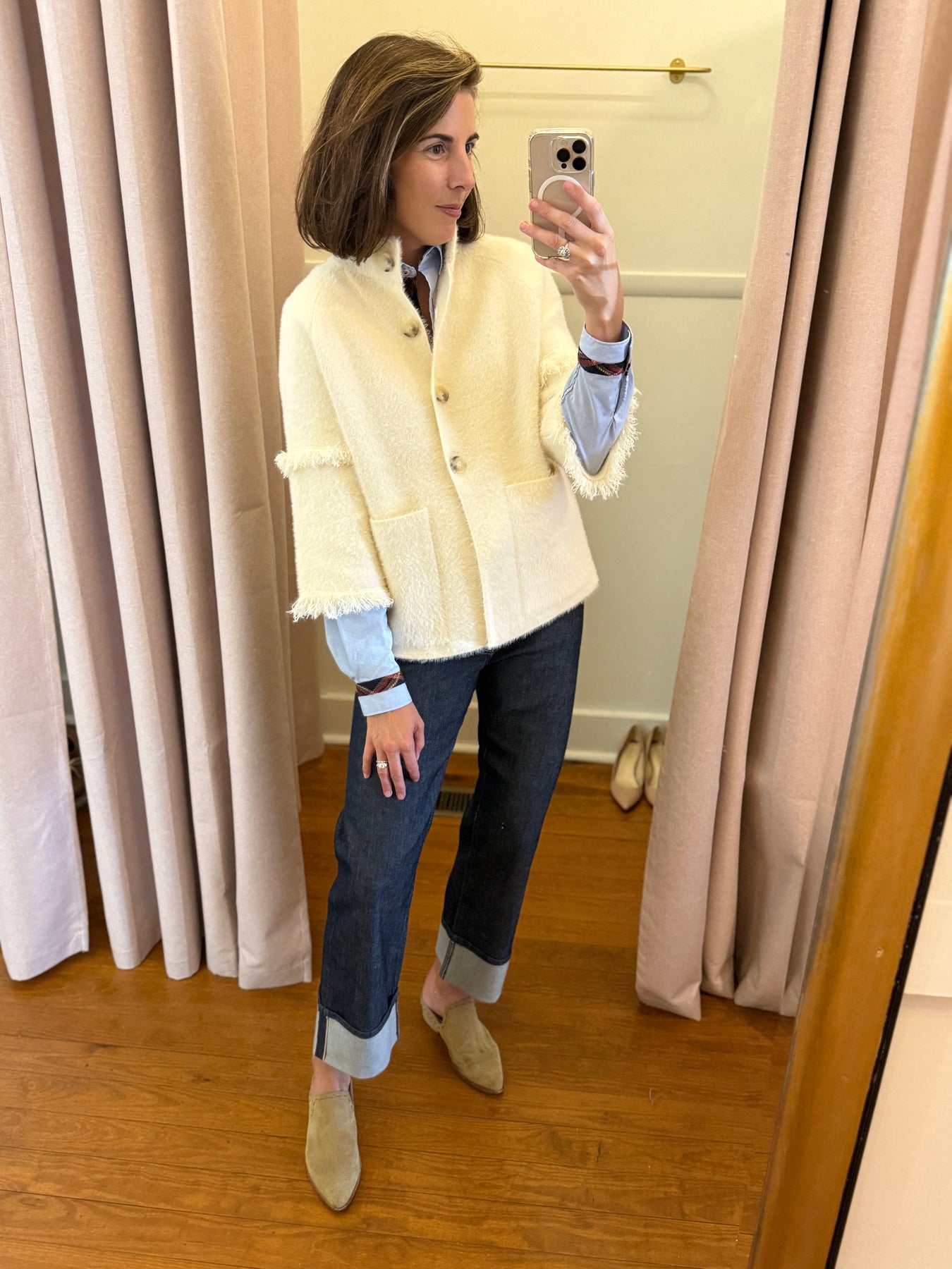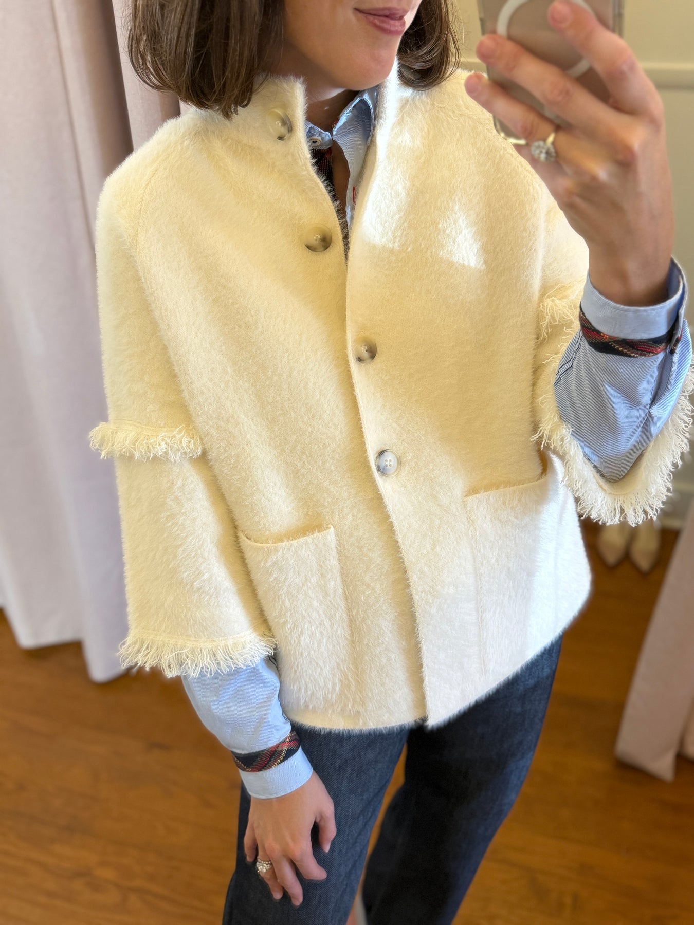 Angie fringe detail short cardigan, fuzzy knit, stand collar, front button closure, 2 front patch pockets, fringe detail on sleeves, relaxed fit.