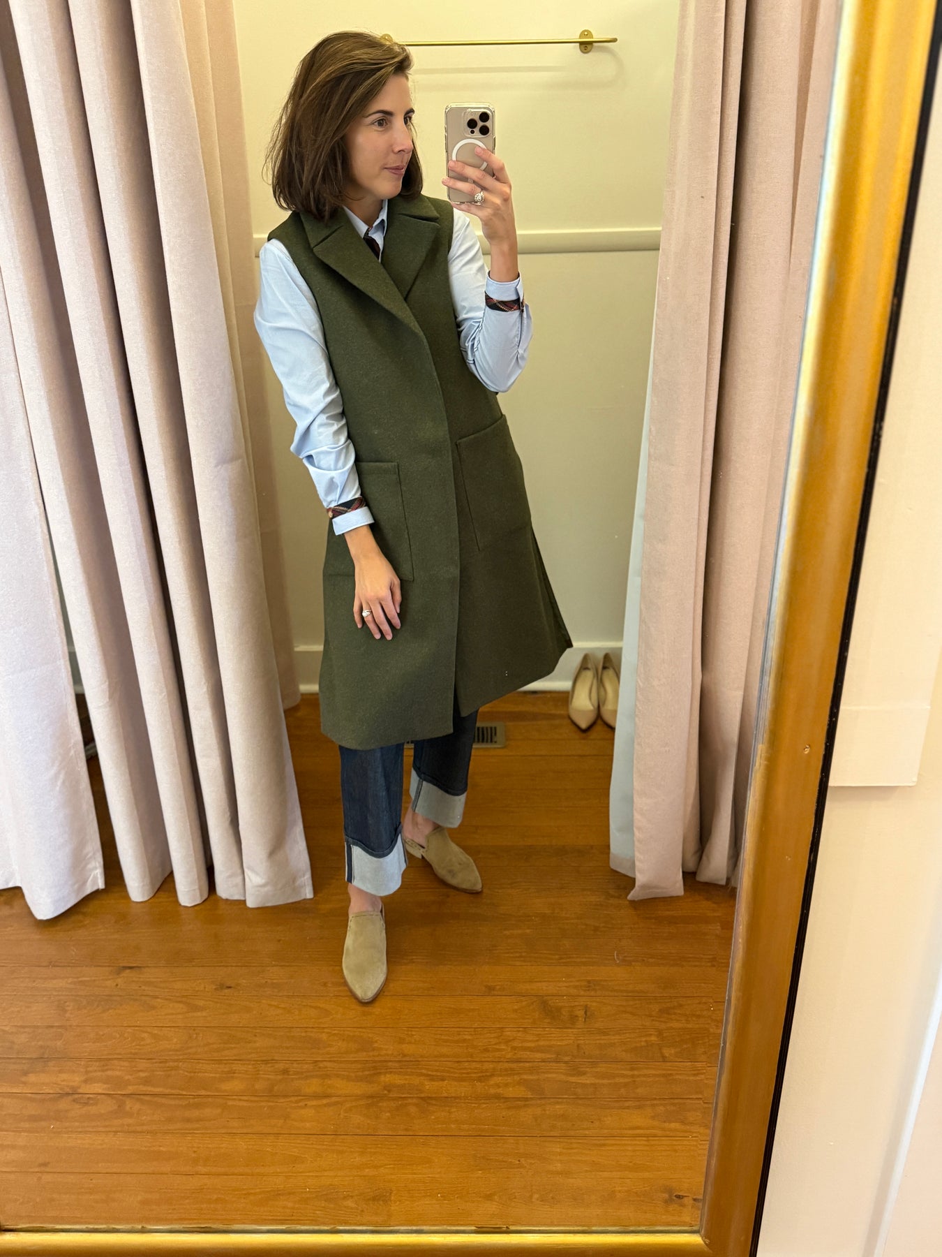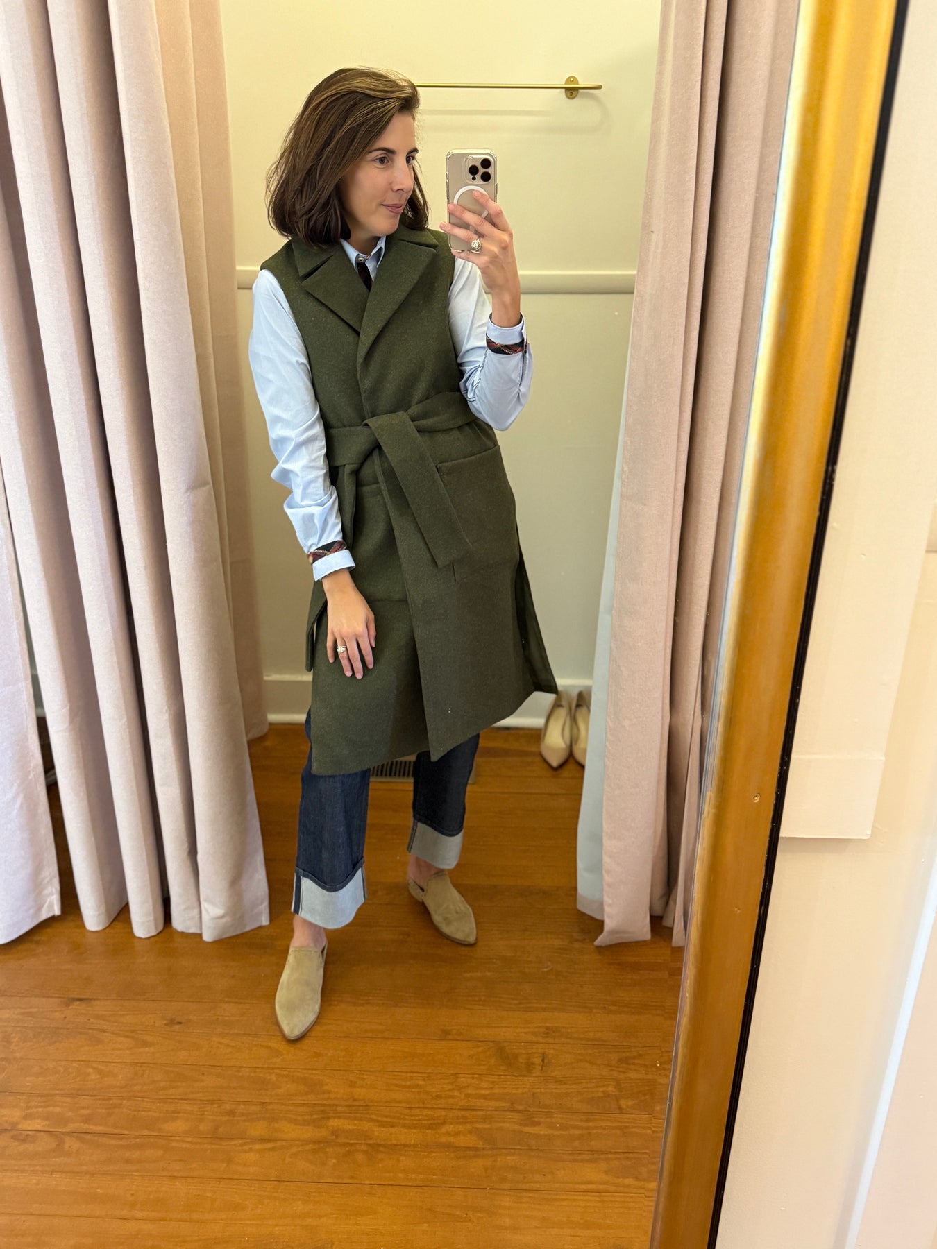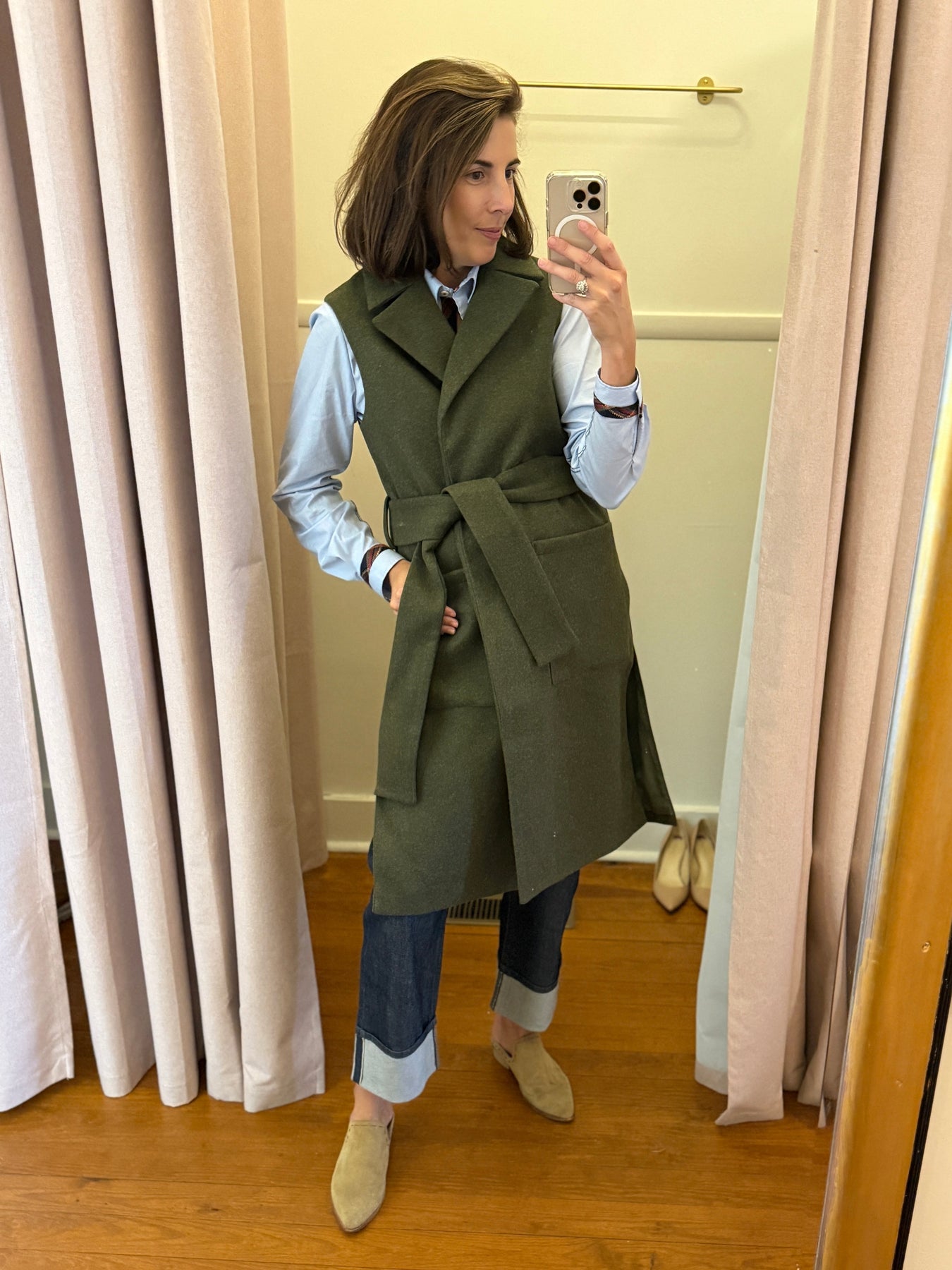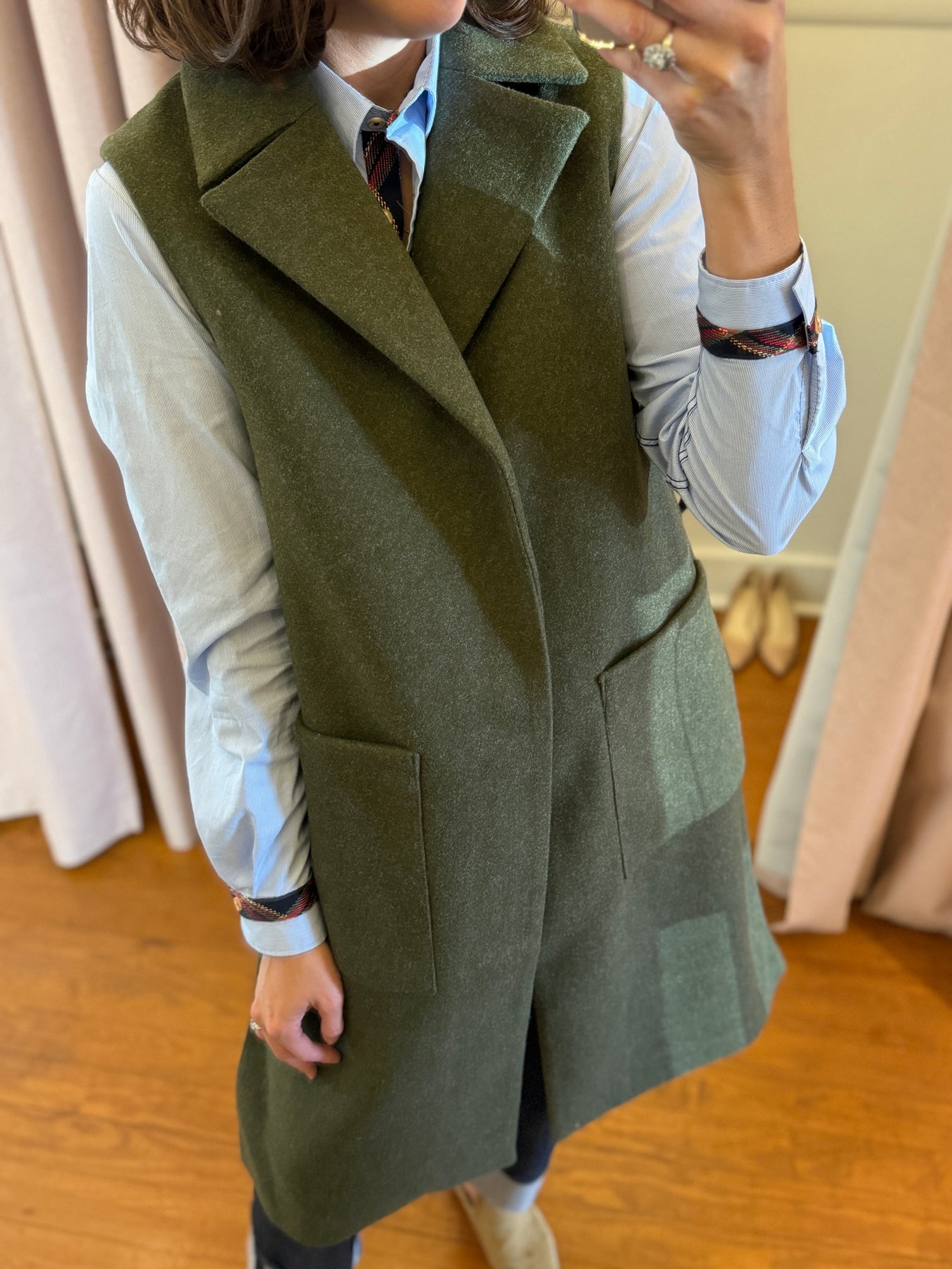 Brie double face vest, notched collar, wrap front w/ wrap belt, front patch pockets, side slits, relaxed fit.