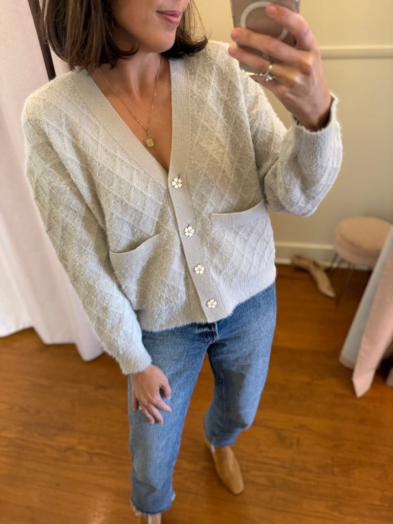 Dolly diamond stitch cardigan, front button down closure, front patch pockets, embroidery trim, relaxed fit.