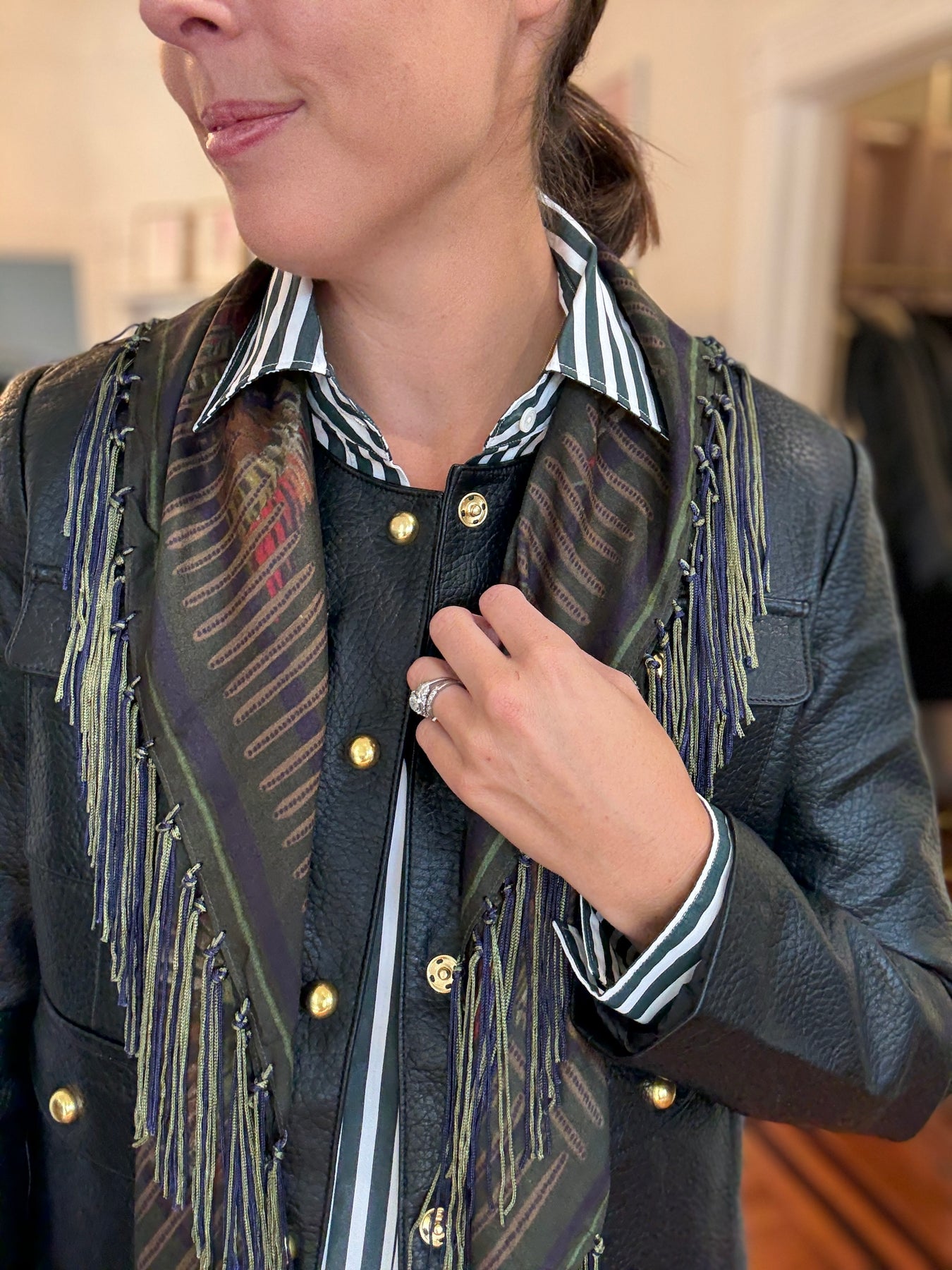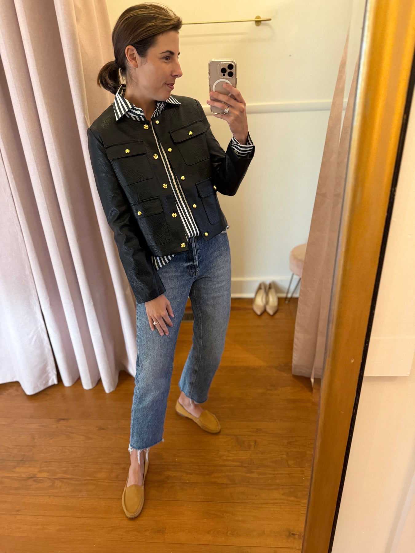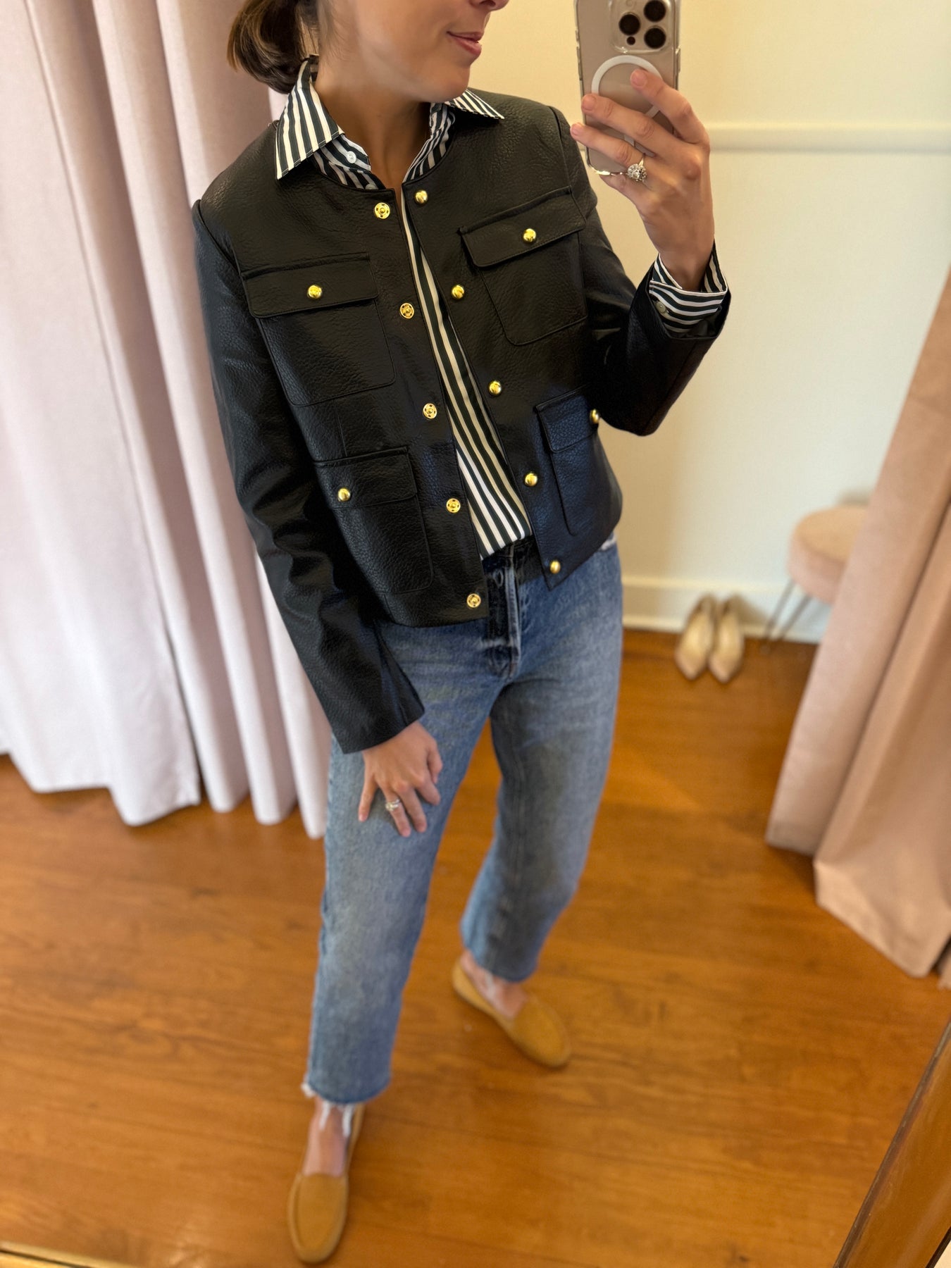 Julie leather jacket, pebble textured vegan leather jacket, scoop neck, front button down closure, front flap pockets, boxy fit.