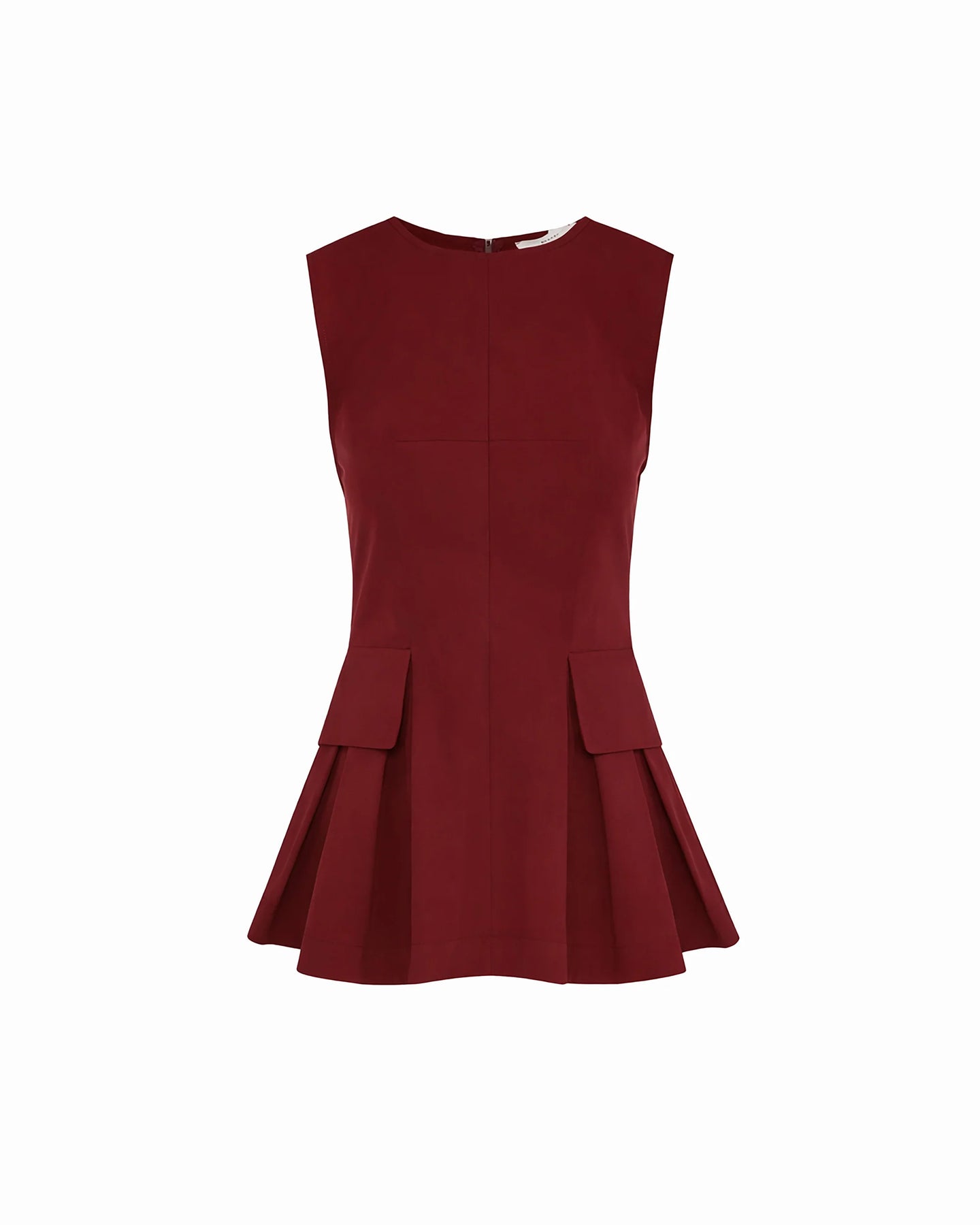 Sleeveless top, featuring a structured and contemporary silhouette. Side pleats with patch pockets add volume and movement to the piece. A clean and sophisticated design, perfect for modern and refined looks.