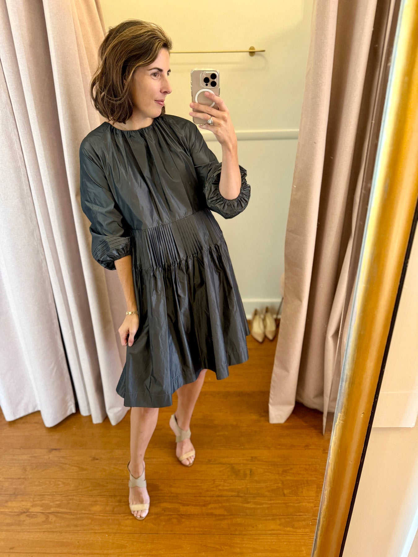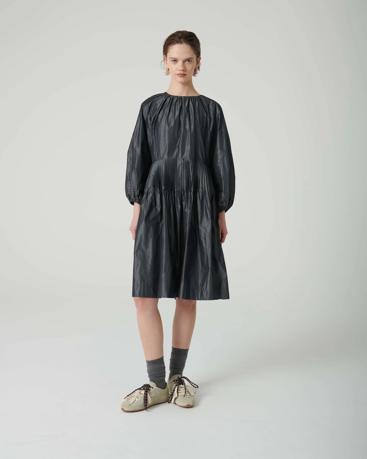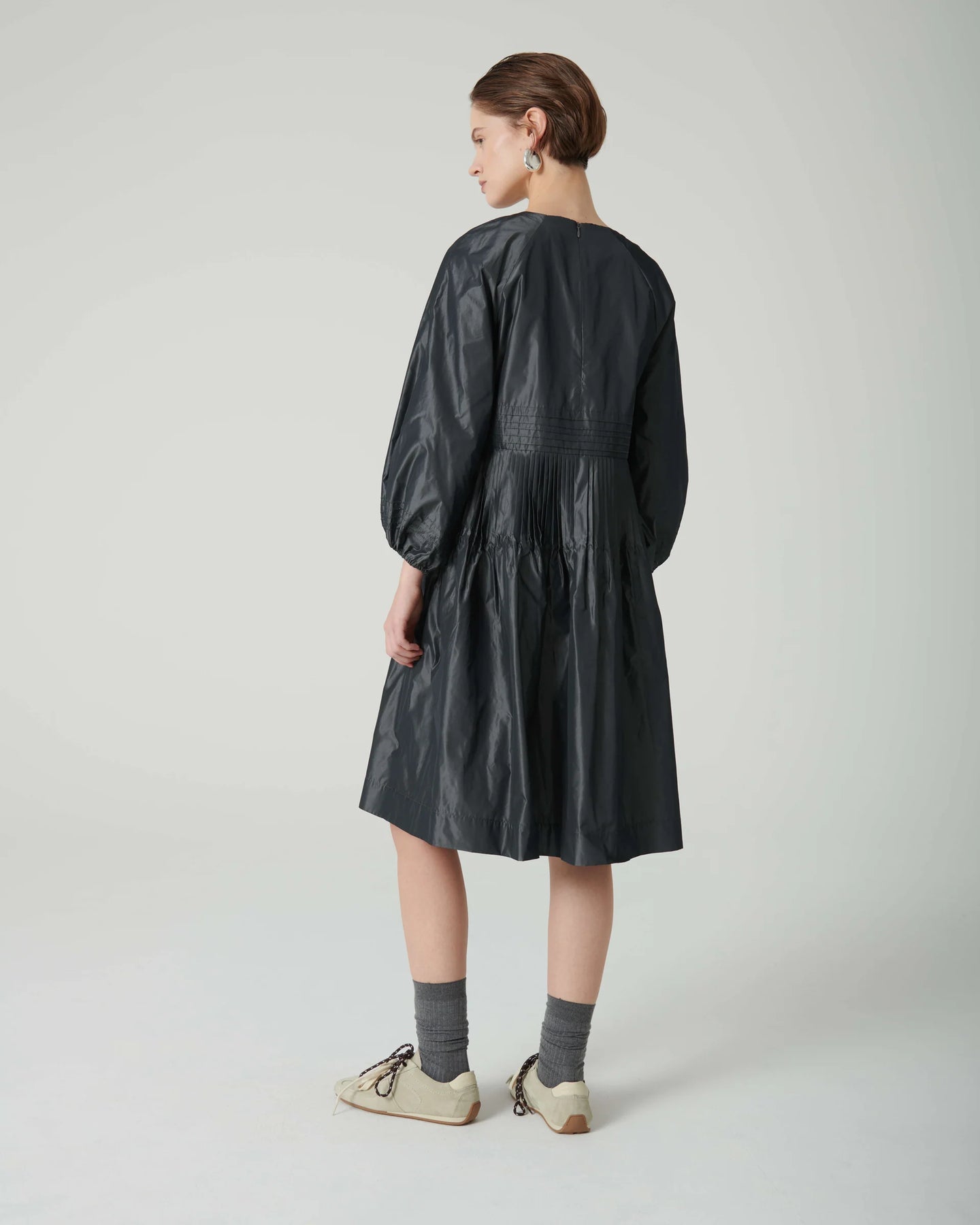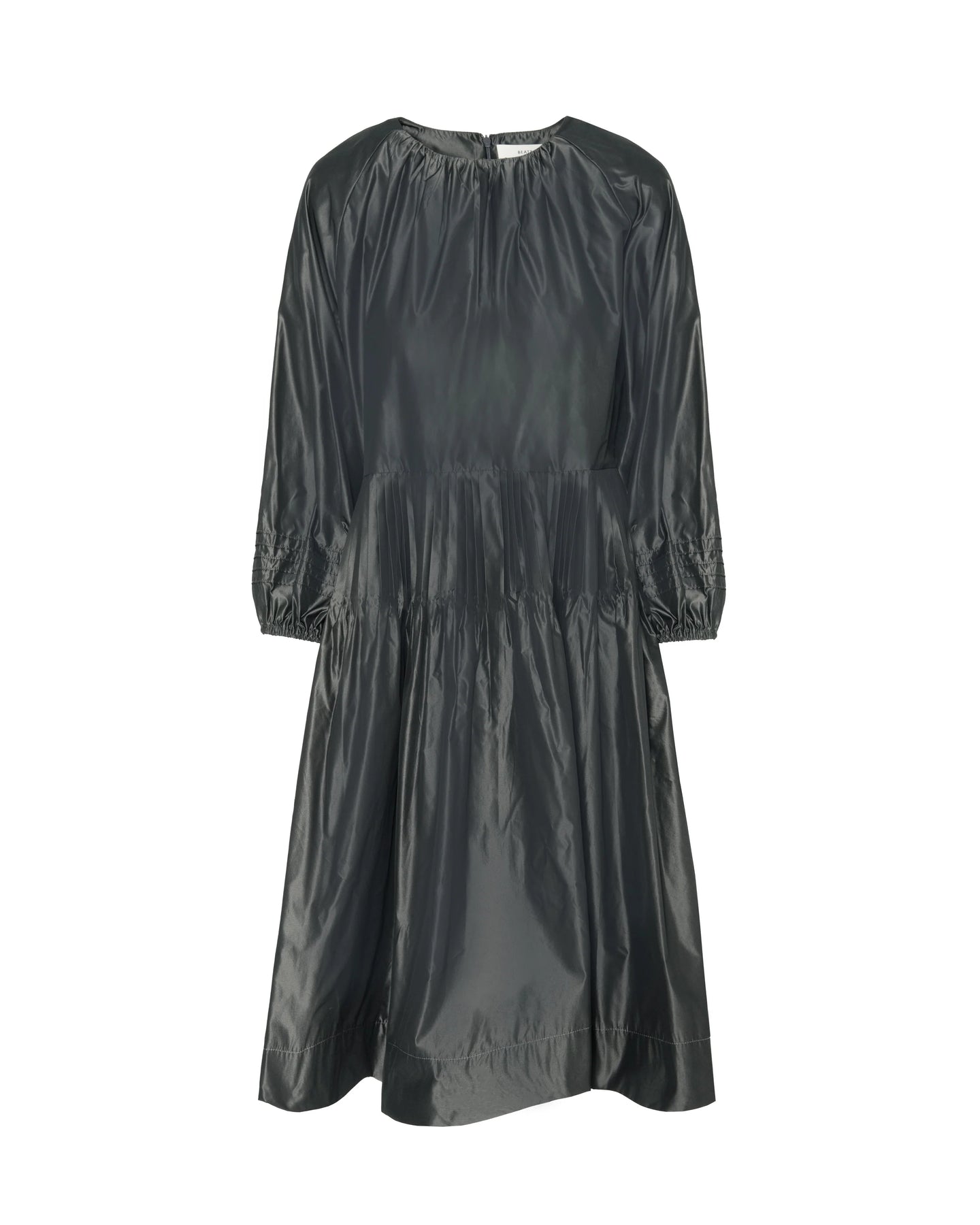 This short dress, made from iridescent taffeta, features a crew neckline, three-quarter length sleeves with stitched pleats and elastic at the cuffs. The short skirt with micro pleats and side pockets at the hips completes the design. Made in Italy.