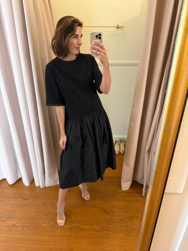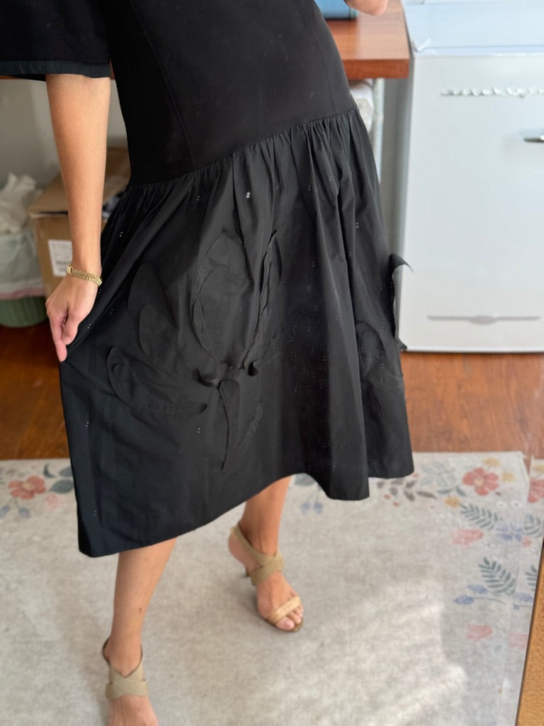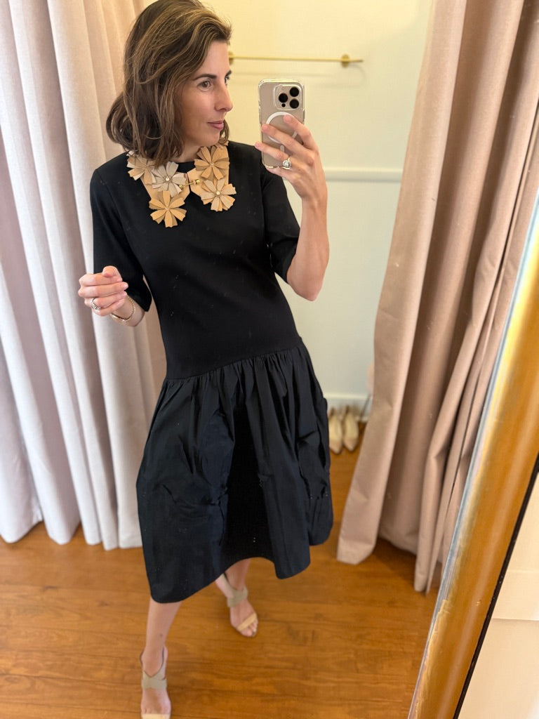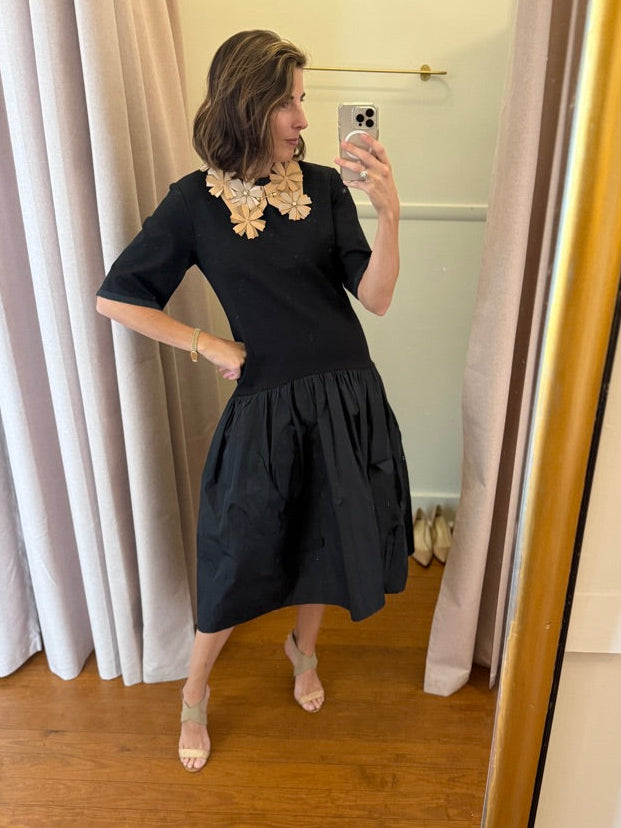 Chic midi dress with black ponte body and taffeta skirt with floral detail. Your classic black dress with a twist. Shown with a JAHDE queen collar (not included)