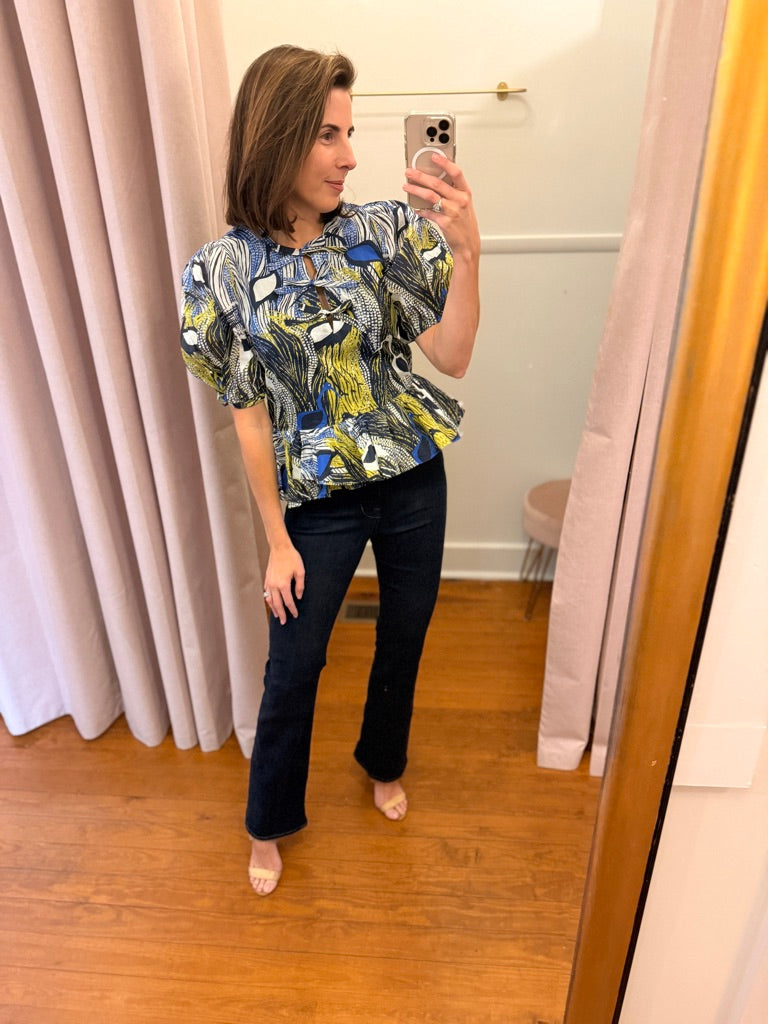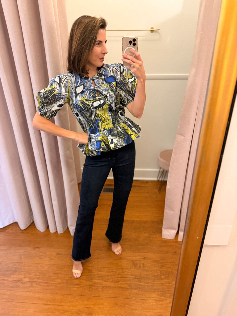 Feminine details define the Estella top, from the tie-front V-neck to the puff sleeves and peplum waist. Versatile by design, it pairs effortlessly with denim, tailored shorts, or the matching Owens skirt. Rendered here in Heron, an abstract avian print in chartreuse, cobalt, and white on a navy ground.