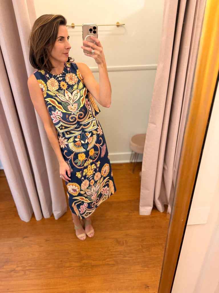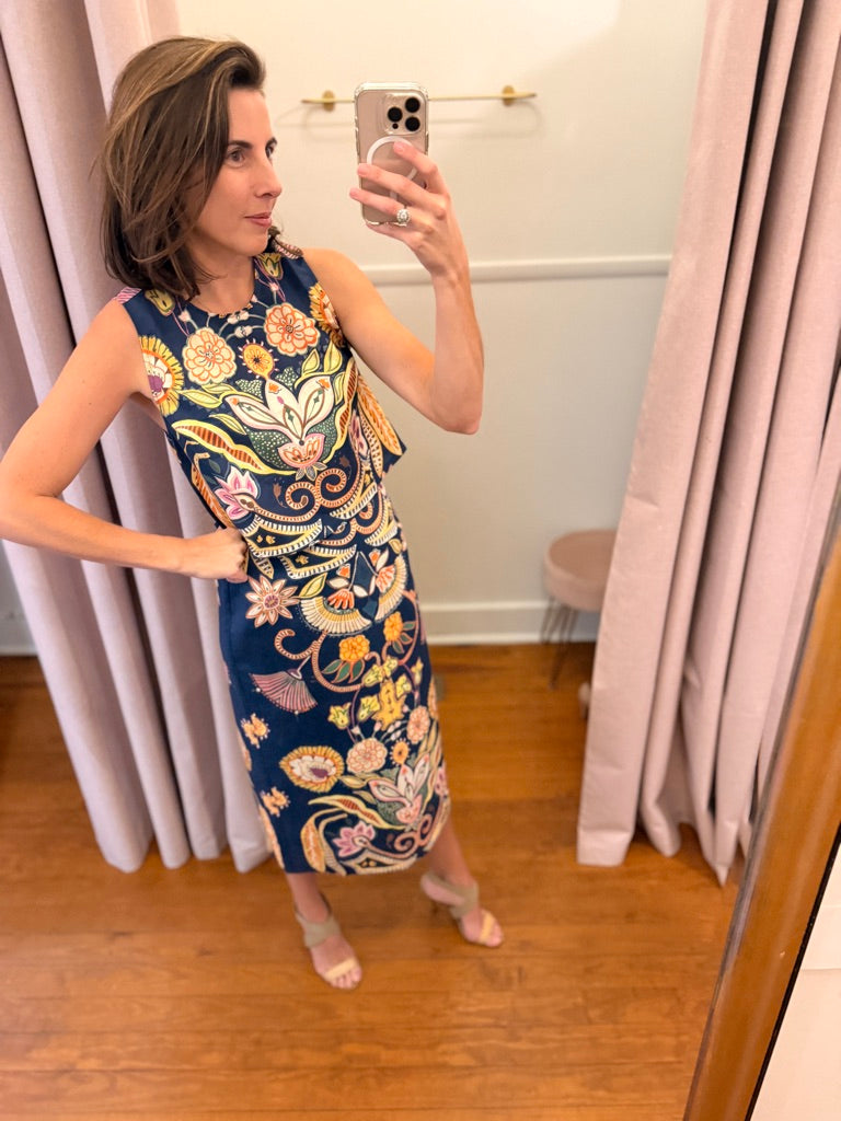 Finished with buttons up the back, this cropped shell is offered in Neptune, our abstract placement floral set against a muted navy ground. Fallon was designed to pair seamlessly with the matching Sutton skirt, creating an elegant spring and summer set with a Mediterranean sensibility.