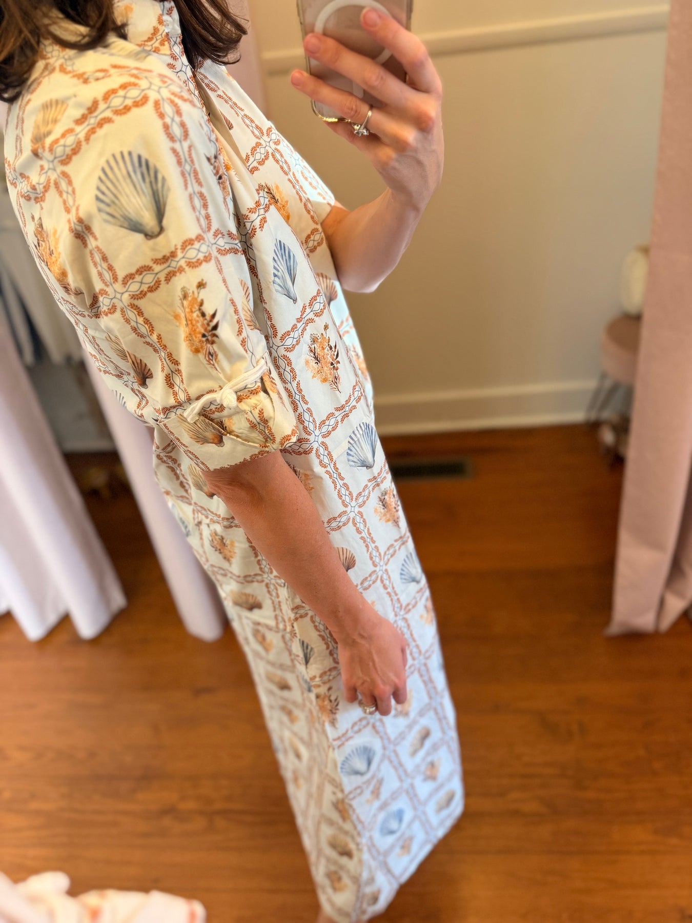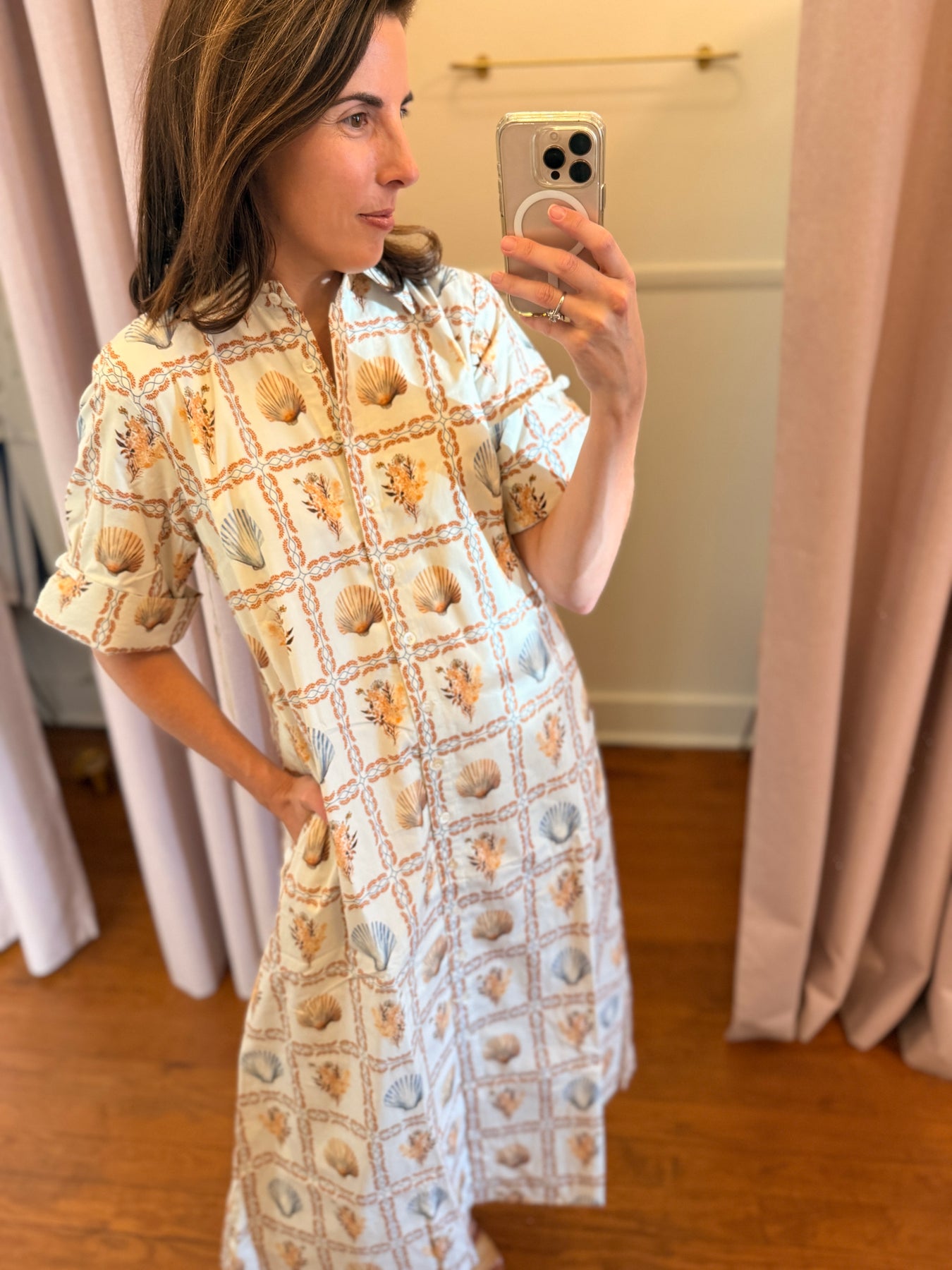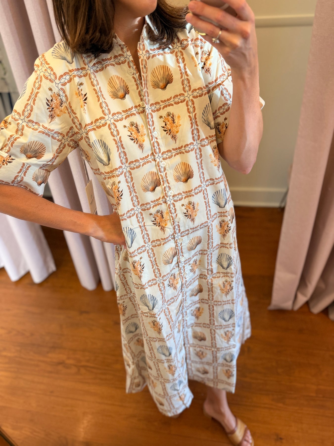 Effortless, flattering, and endlessly versatile — this mid-length shirt dress was made for every season. Designed in a relaxed yet feminine silhouette, it features a full button-down front, cuffed sleeves with delicate appliqué detail, and just the right amount of drape for movement and comfort. Pair it with boots for crisp fall mornings or sandals for breezy resort days — a true all-season favorite that looks as good as it feels. Made from a soft, breathable fabric with UPF 50+ protection, it ensures you stay comfortable and stylish while staying protected from the sun.