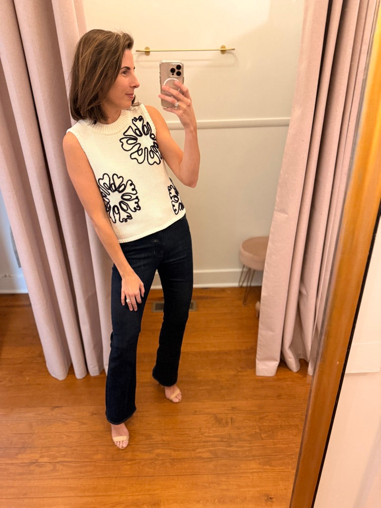 The Natasha top delivers an easy cropped fit with a classic crewneck, elevated by oversized floral embroidery in navy blue on a crisp white ground. Paired here with the matching Sasha skirt in Blossom, it’s a polished, packable choice for spring getaways