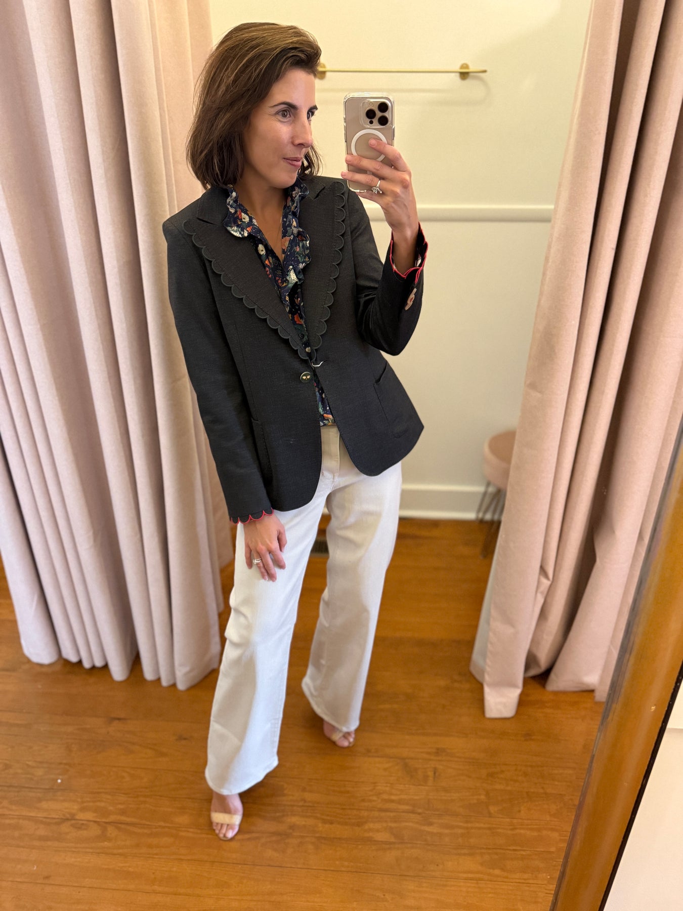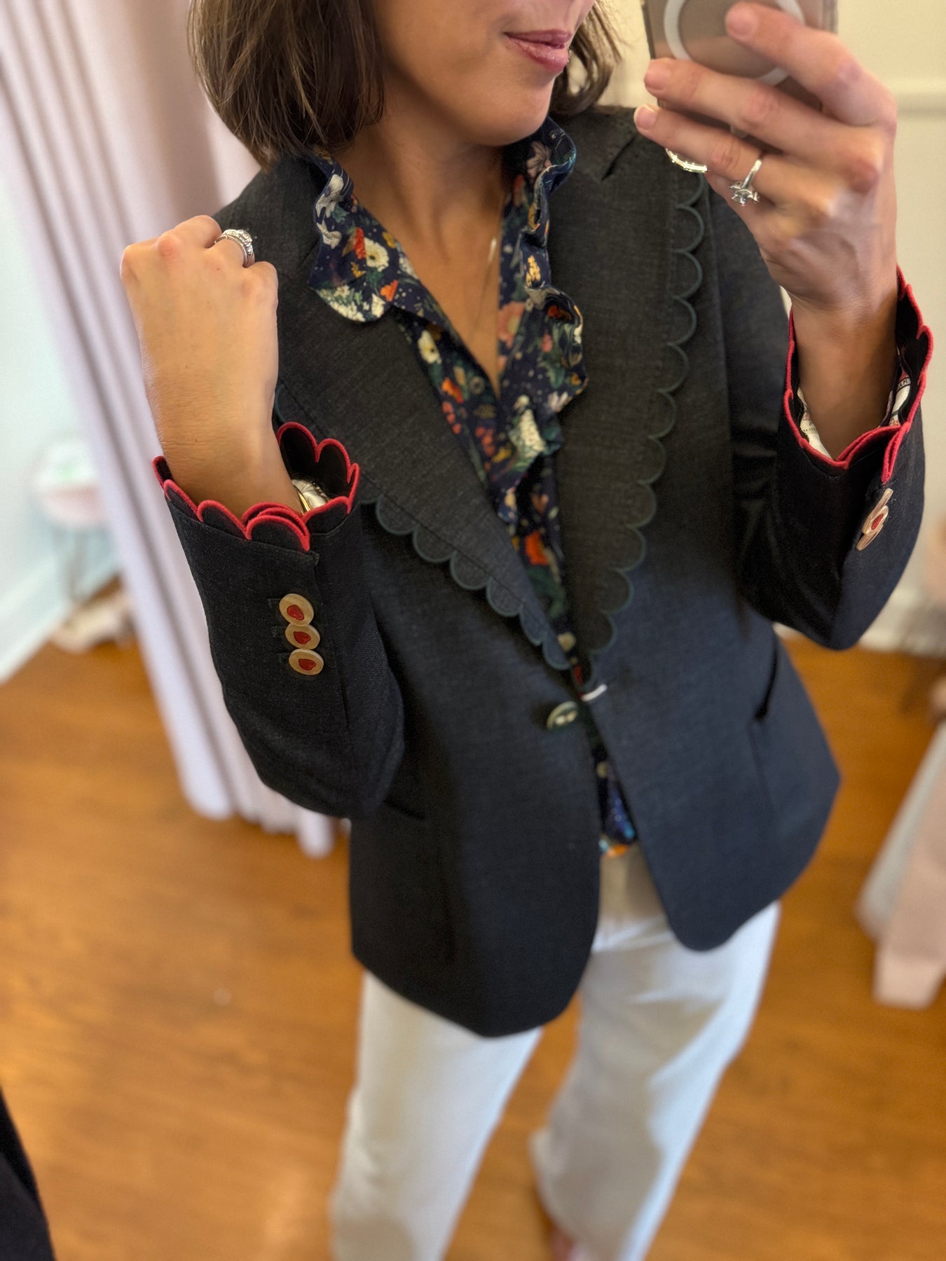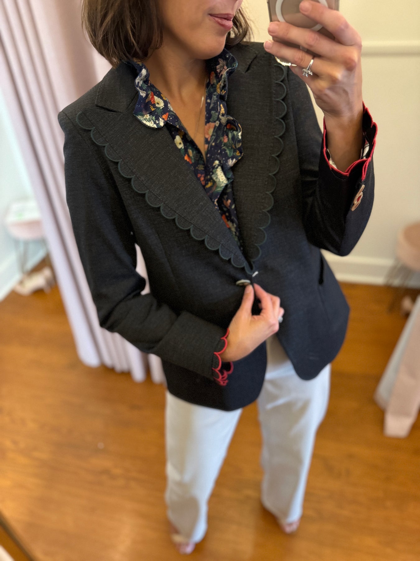 Gray scalloped blazer with the most beautiful button detail
