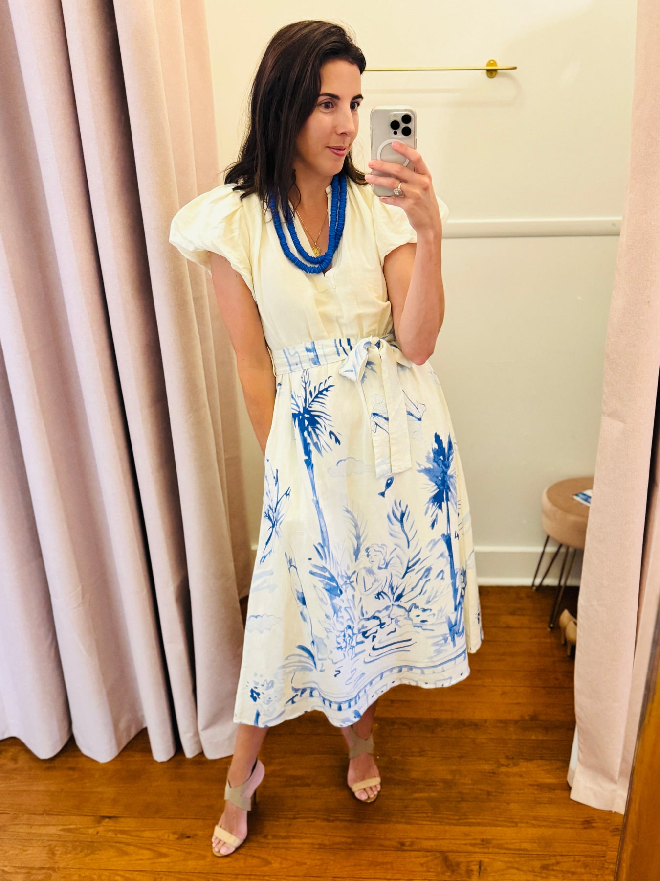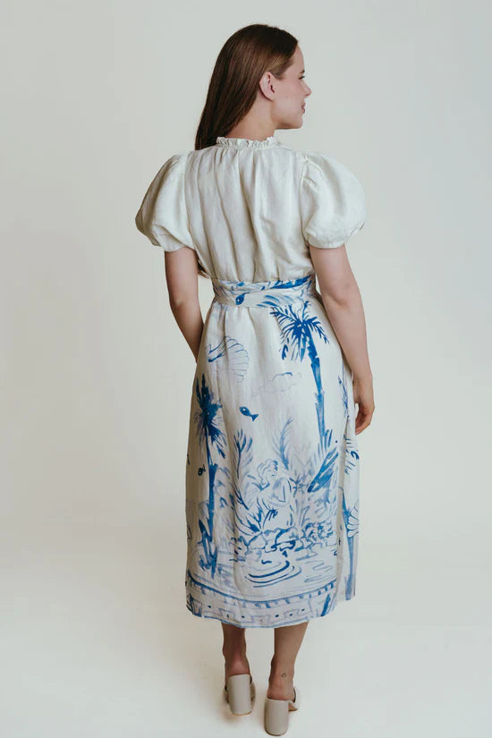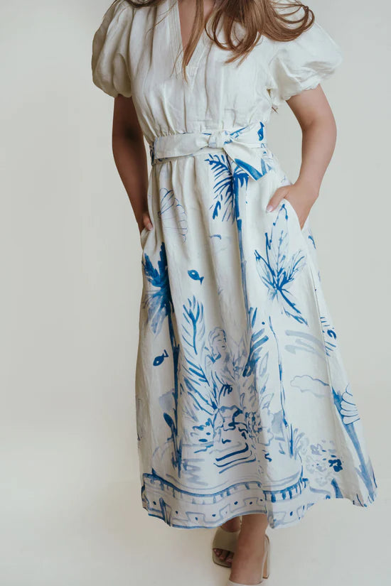 Poof sleeve cotton midi dress with self tie at waist in capri print