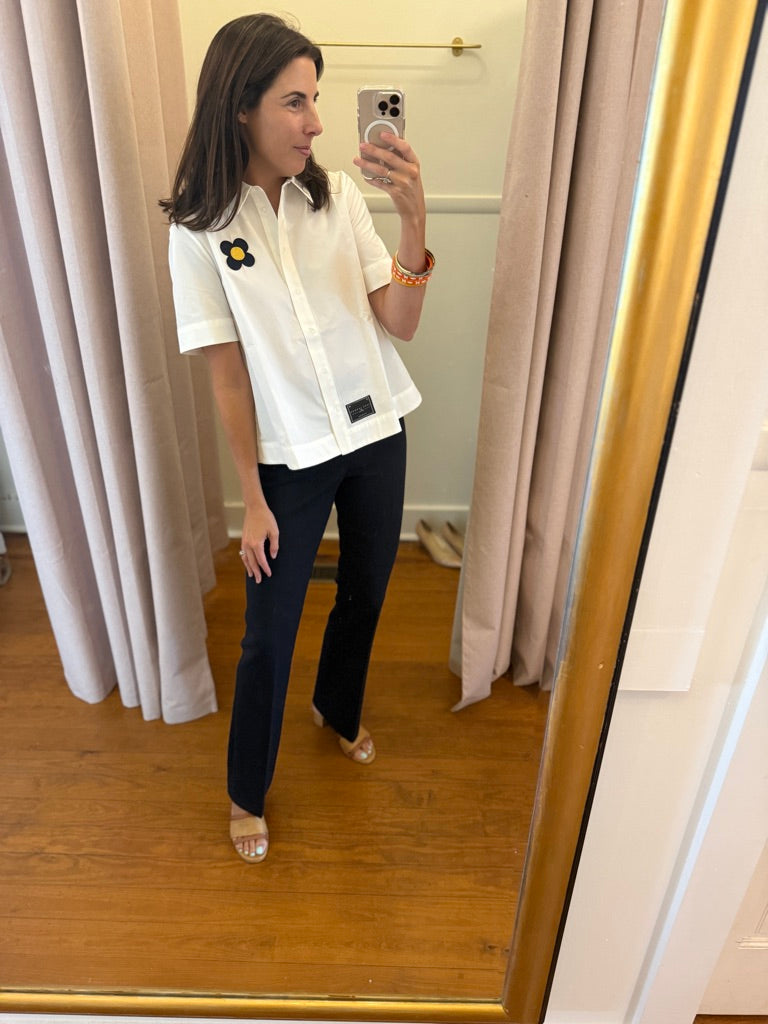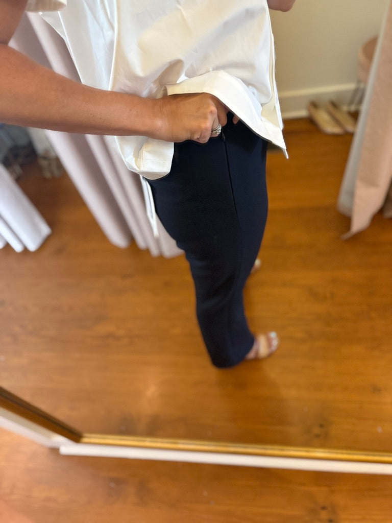 These midnight-blue double-canvas pants have a straight cut, a mid-rise waist and welt pockets on the back. They close at the side with an invisible zip.